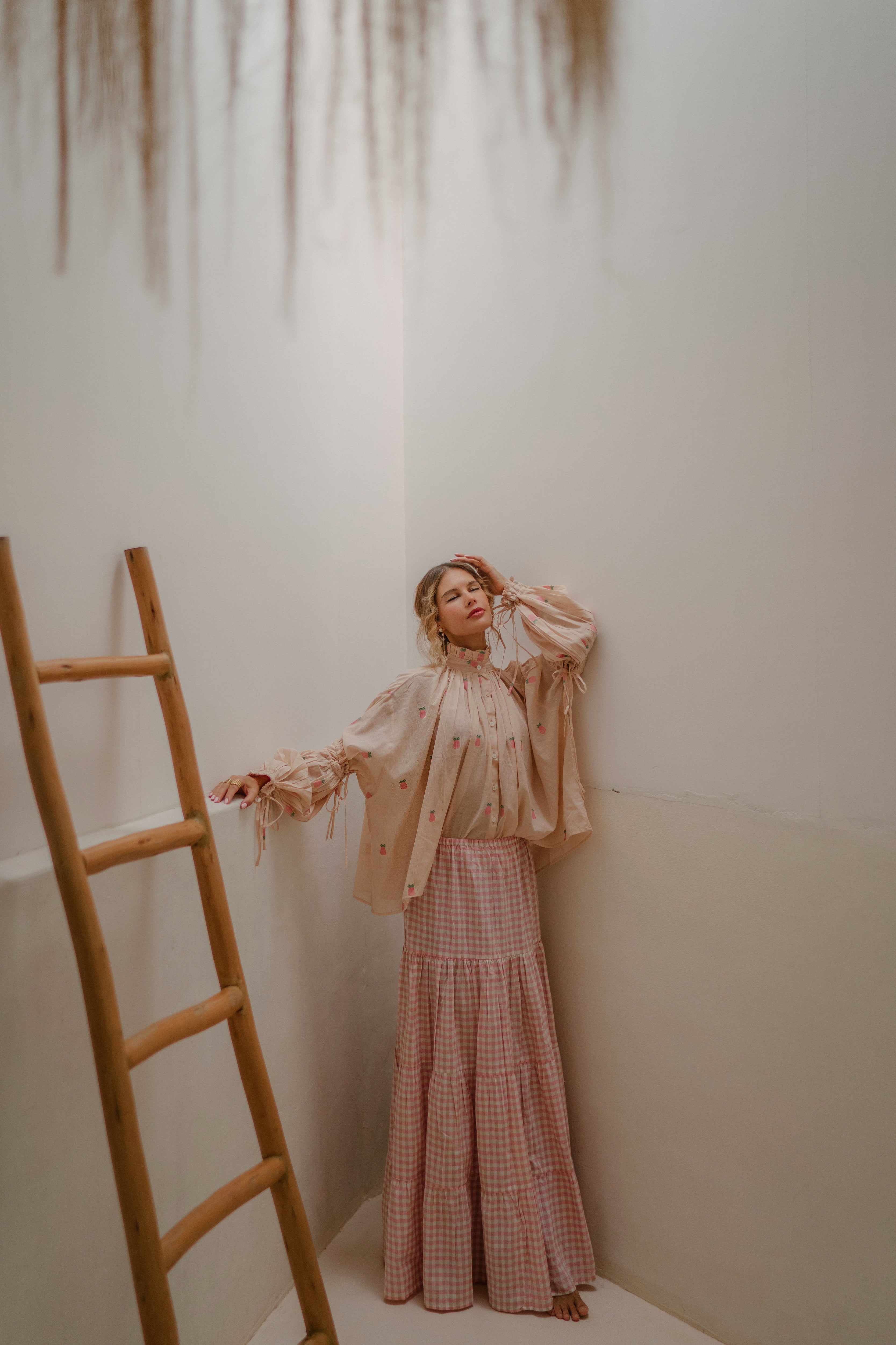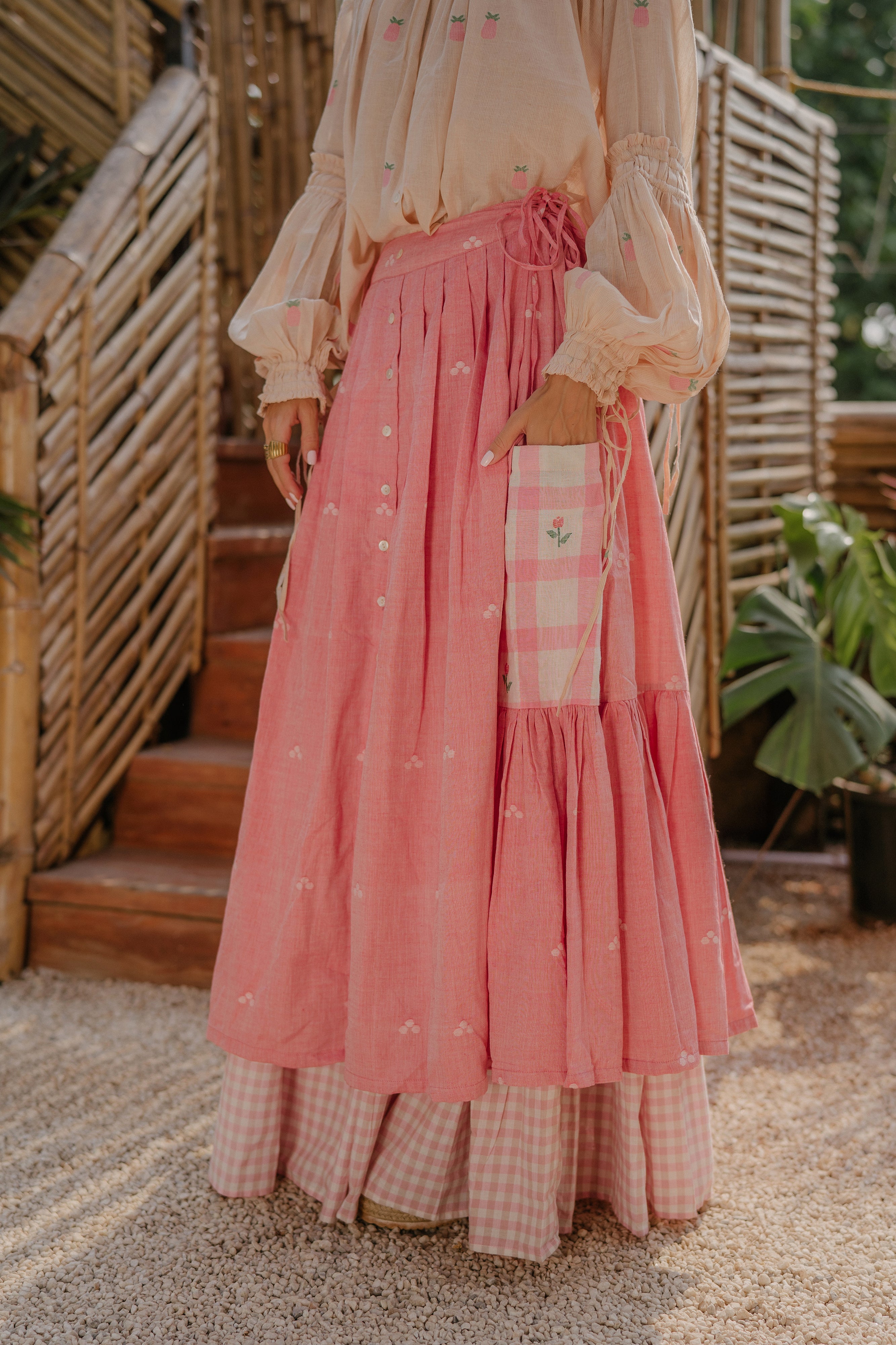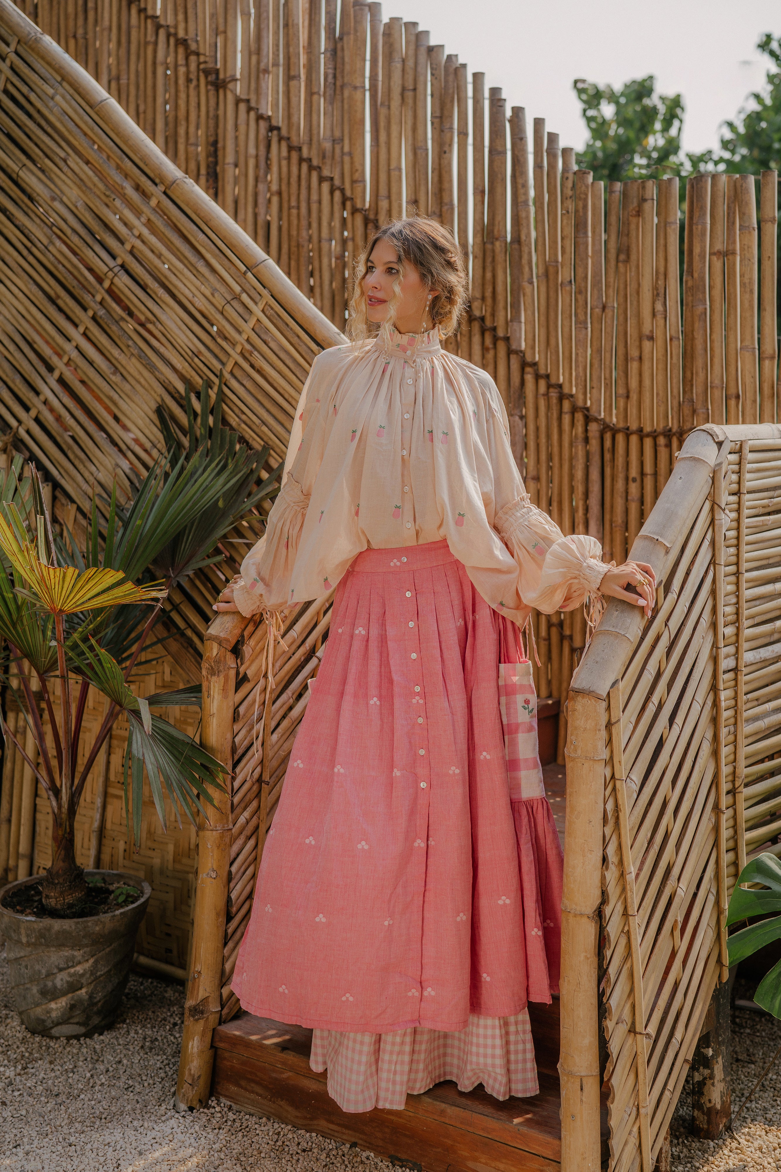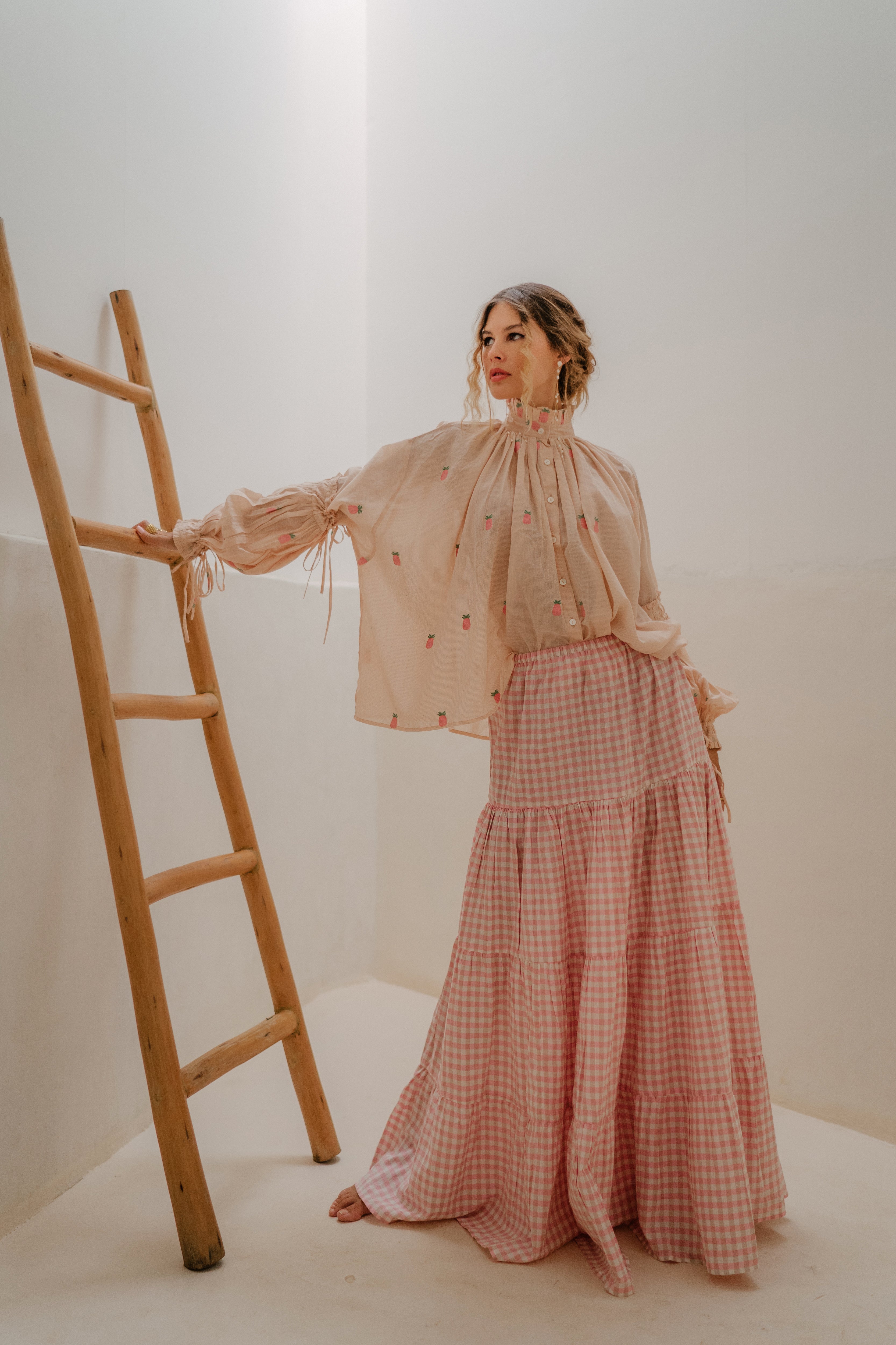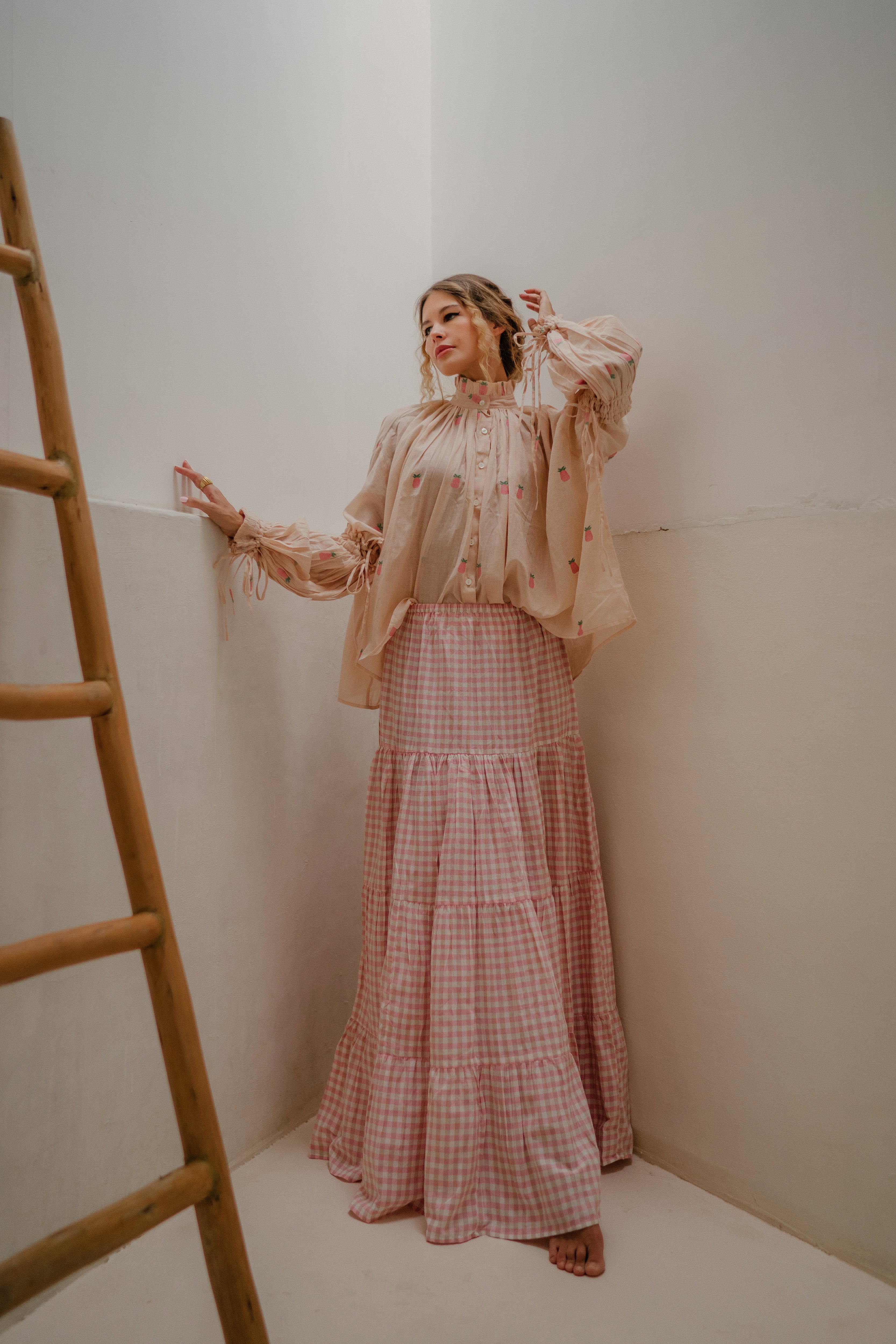 A classic gingham handloom skirt with gentle elastic at the waist. Wear it on it's own with our Seraphine top or layer it as an underskirt with our Lumière button front overskirt. The skirt is slightly snug at the hips and flared at the bottom.