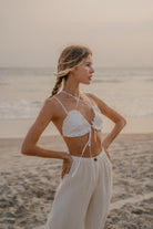 A heart-shaped bralette designed for dreamy holiday days. Featuring dual tie-up closures for an adjustable fit, delicate embroidered daisies scattered across organic cotton, and soft pleated details framing the heart. Fully lined with breathable mul cotton for comfort. A piece to fall in love with and adore for seasons to come.