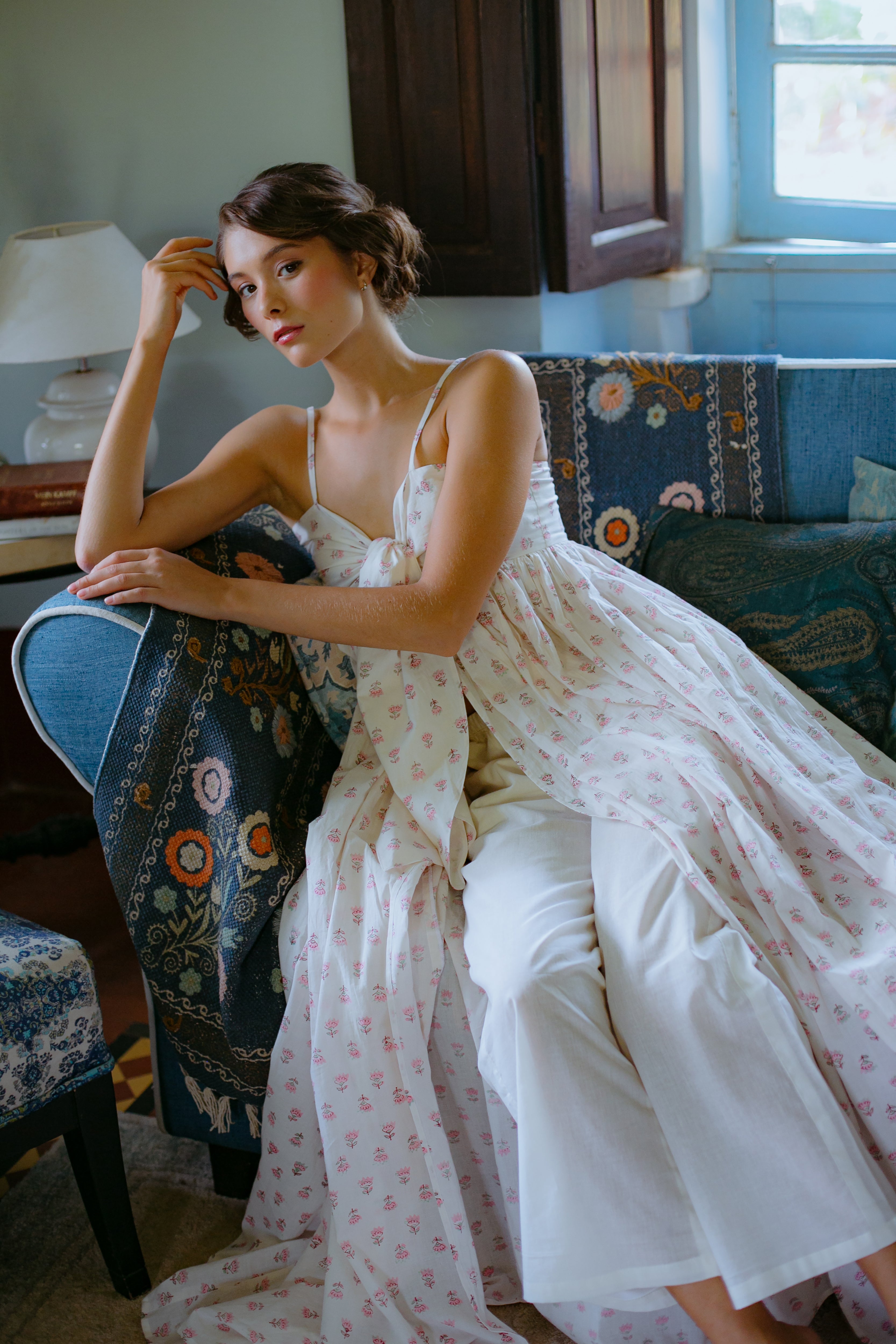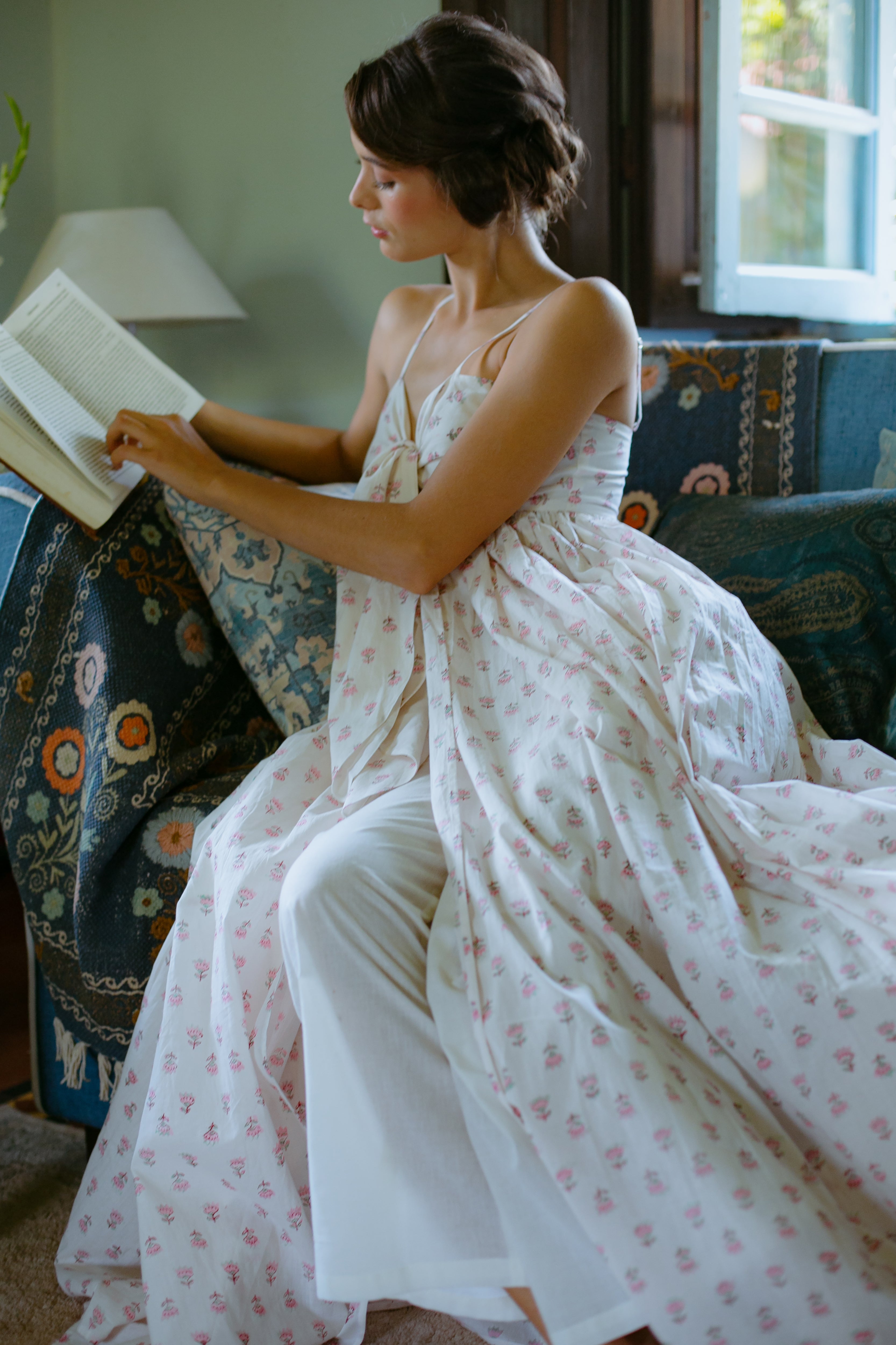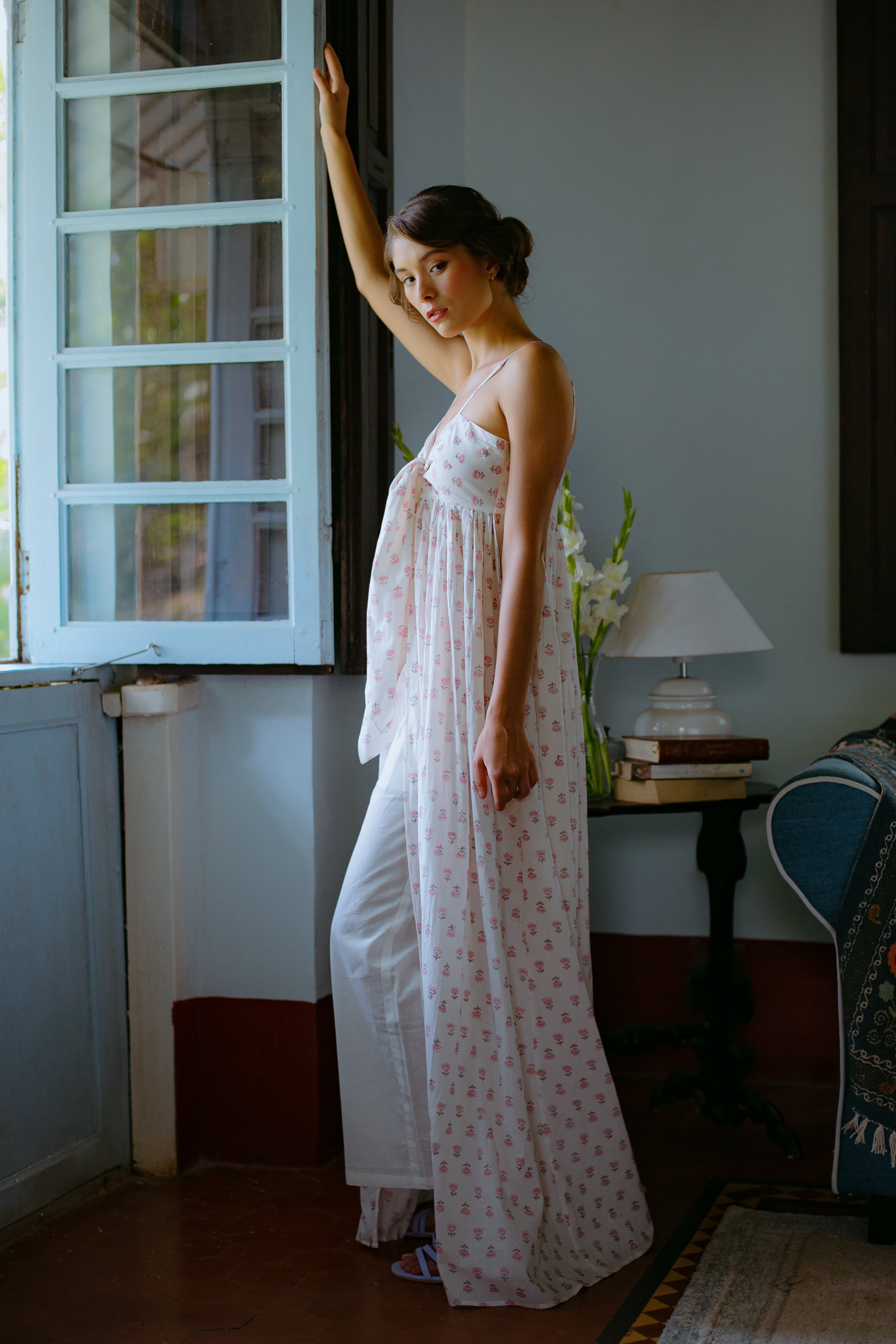 Tie up closure, full flare cape dress, with dramatic full sleeves. Made with over 10 yards of cotton. Comes as a set with a soft white trouser, which acts like an underskirt.
