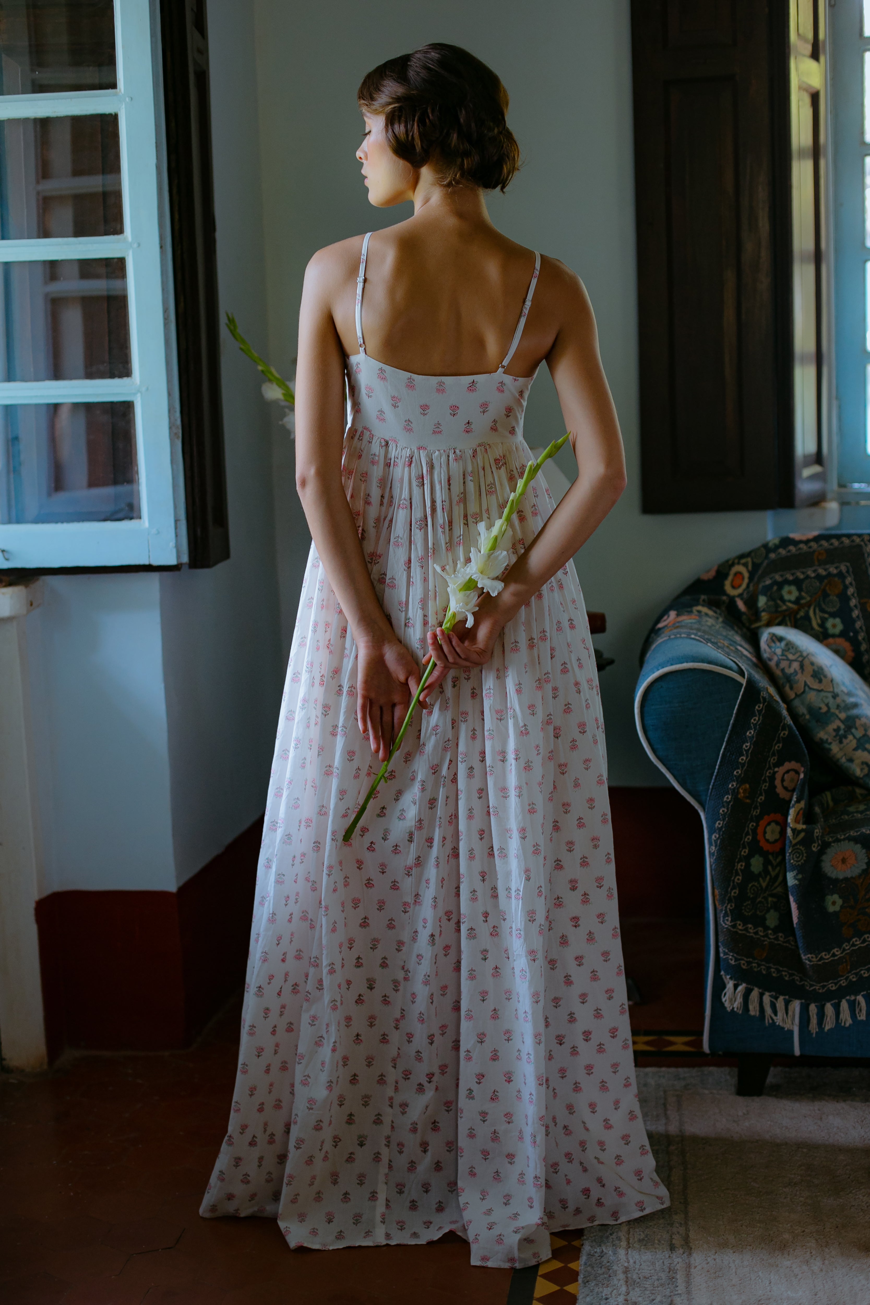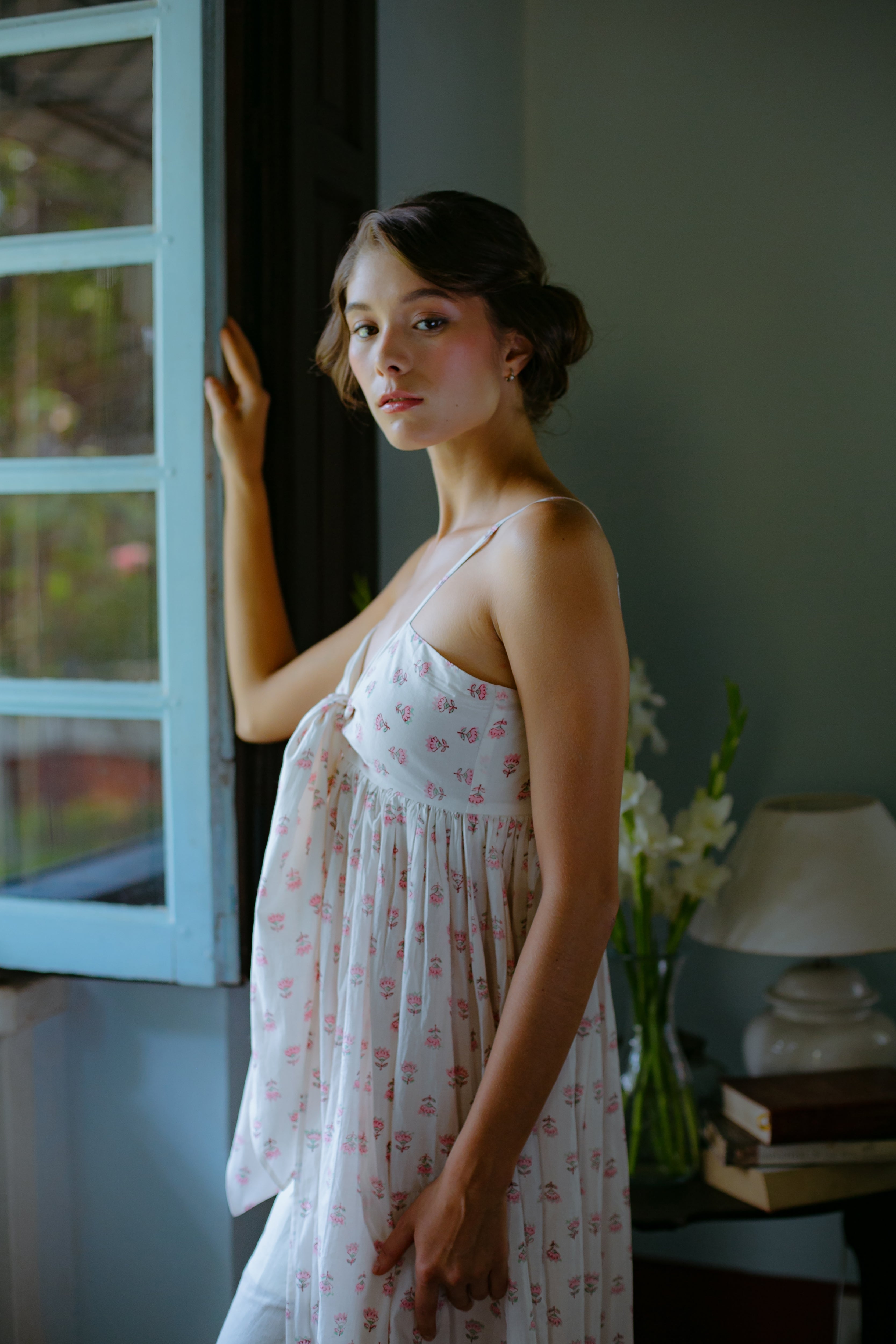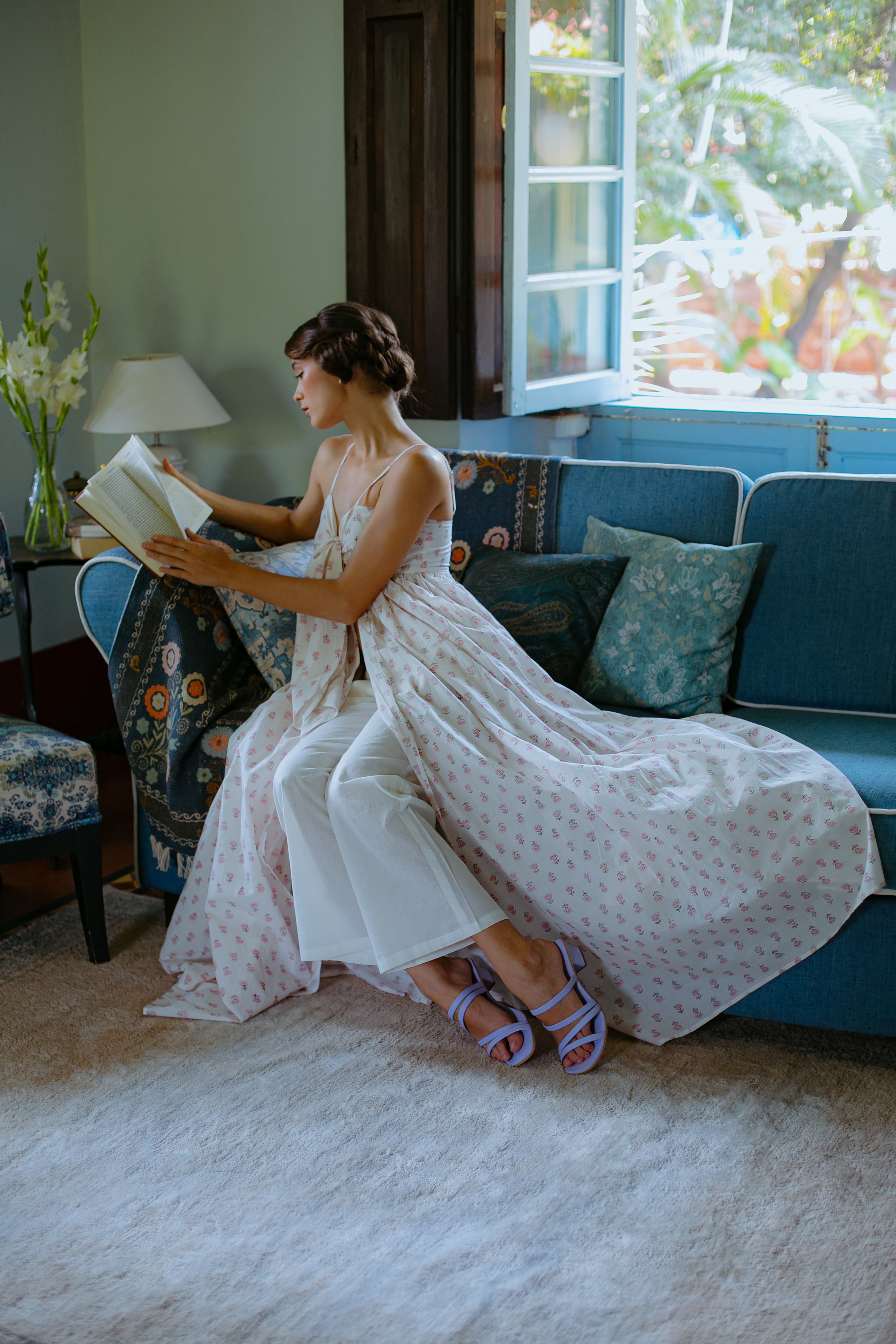 Tie up closure, full flare cape dress, with dramatic full sleeves. Made with over 10 yards of cotton. Comes as a set with a soft white trouser, which acts like an underskirt.