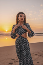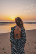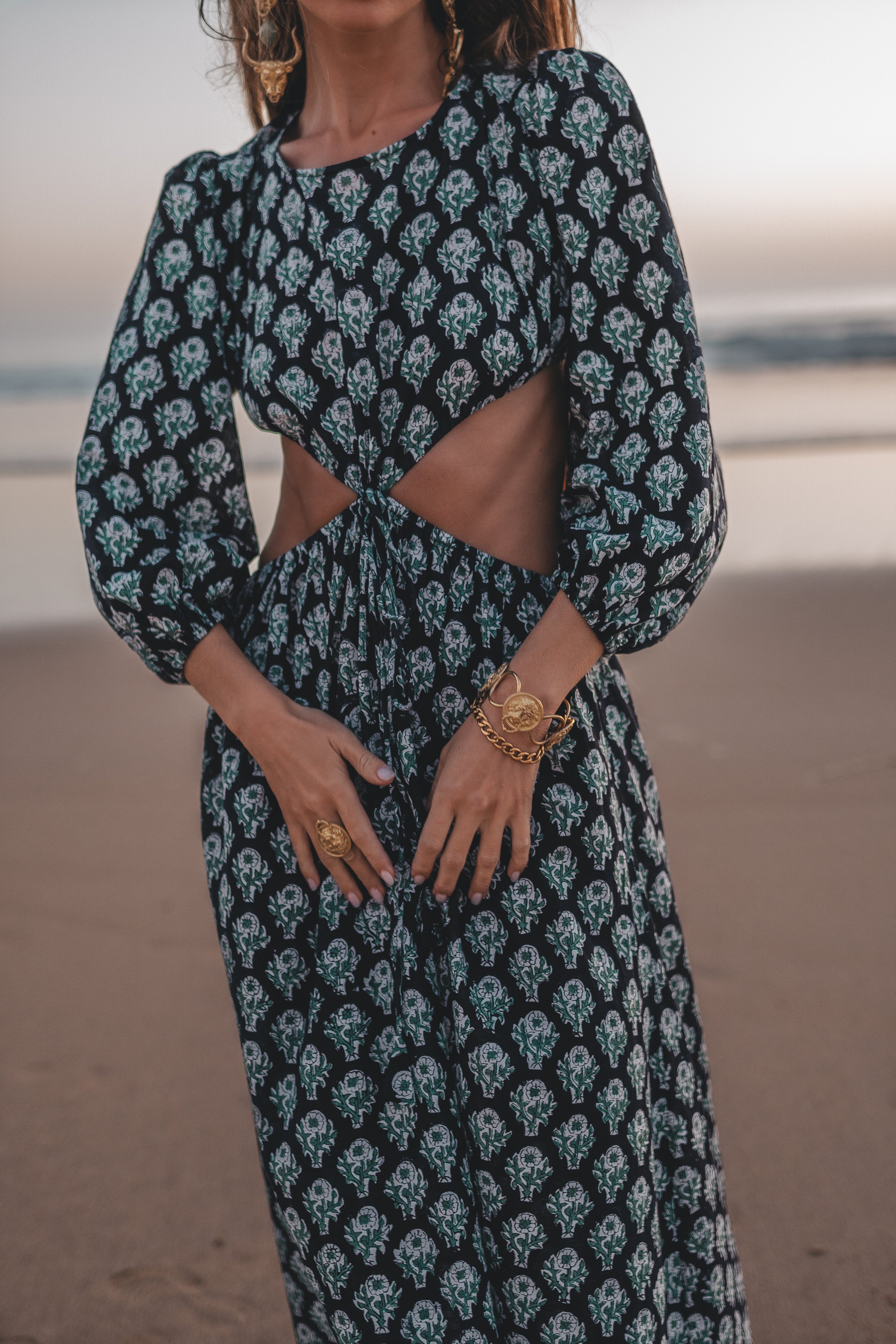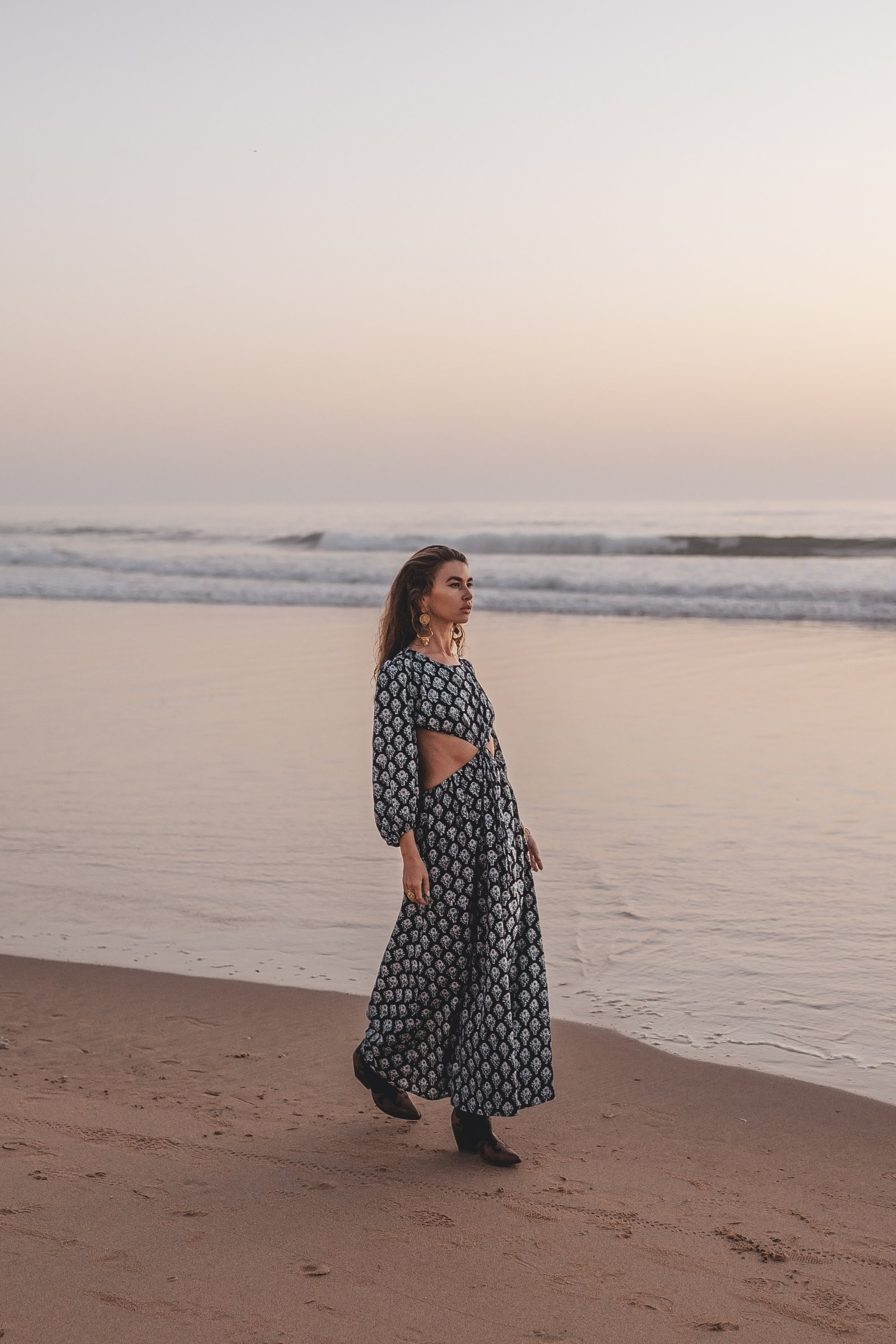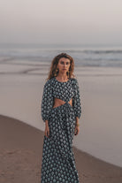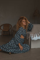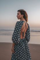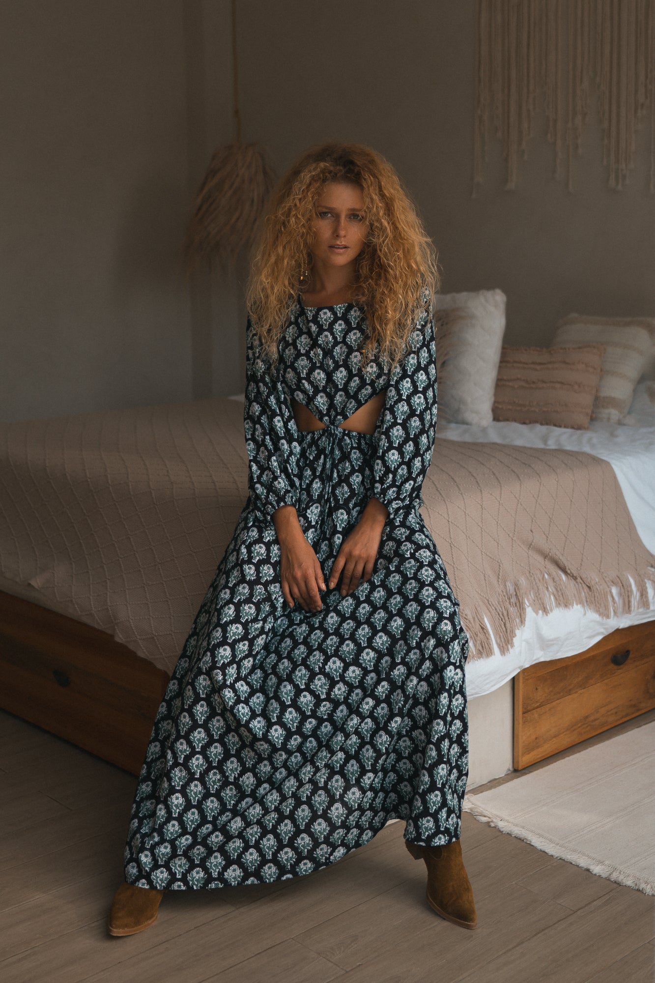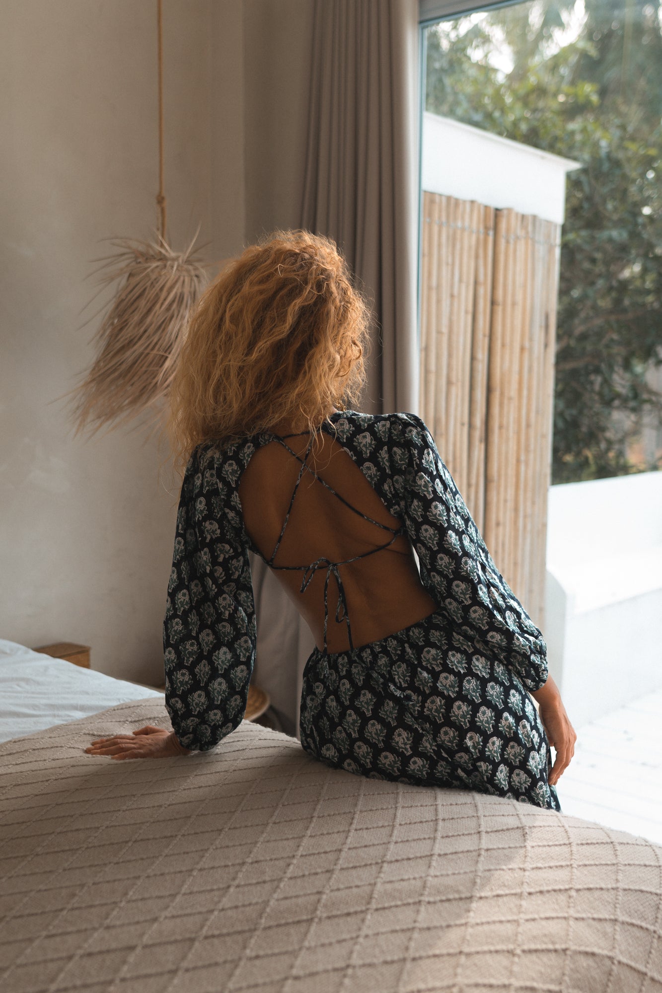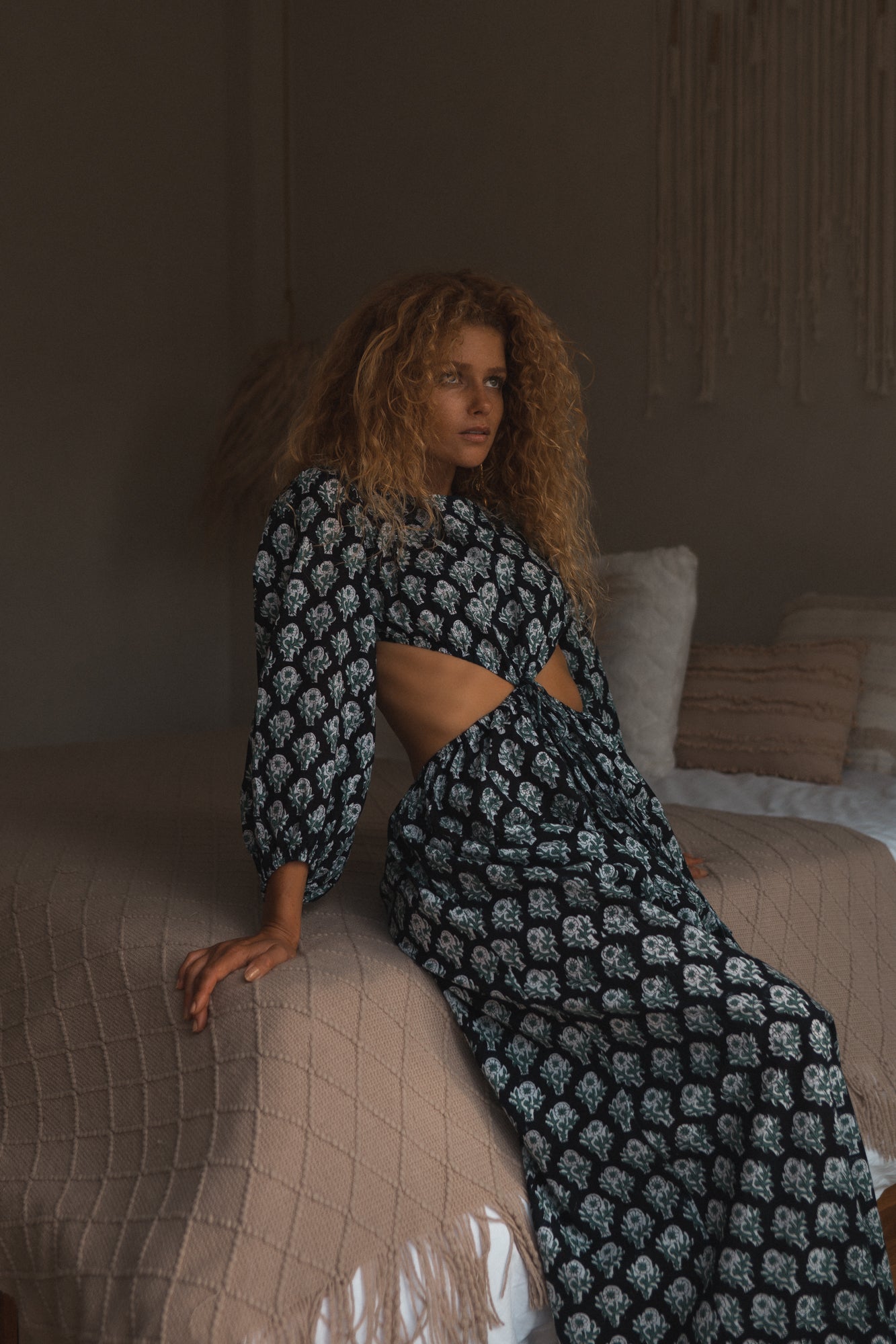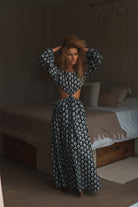 Cut out maxi dress with long balloon sleeves and a full tie closure in the back. Inspired by Audrey's iconic black dress in Breakfast at Tiffany's, featuring a high neck.