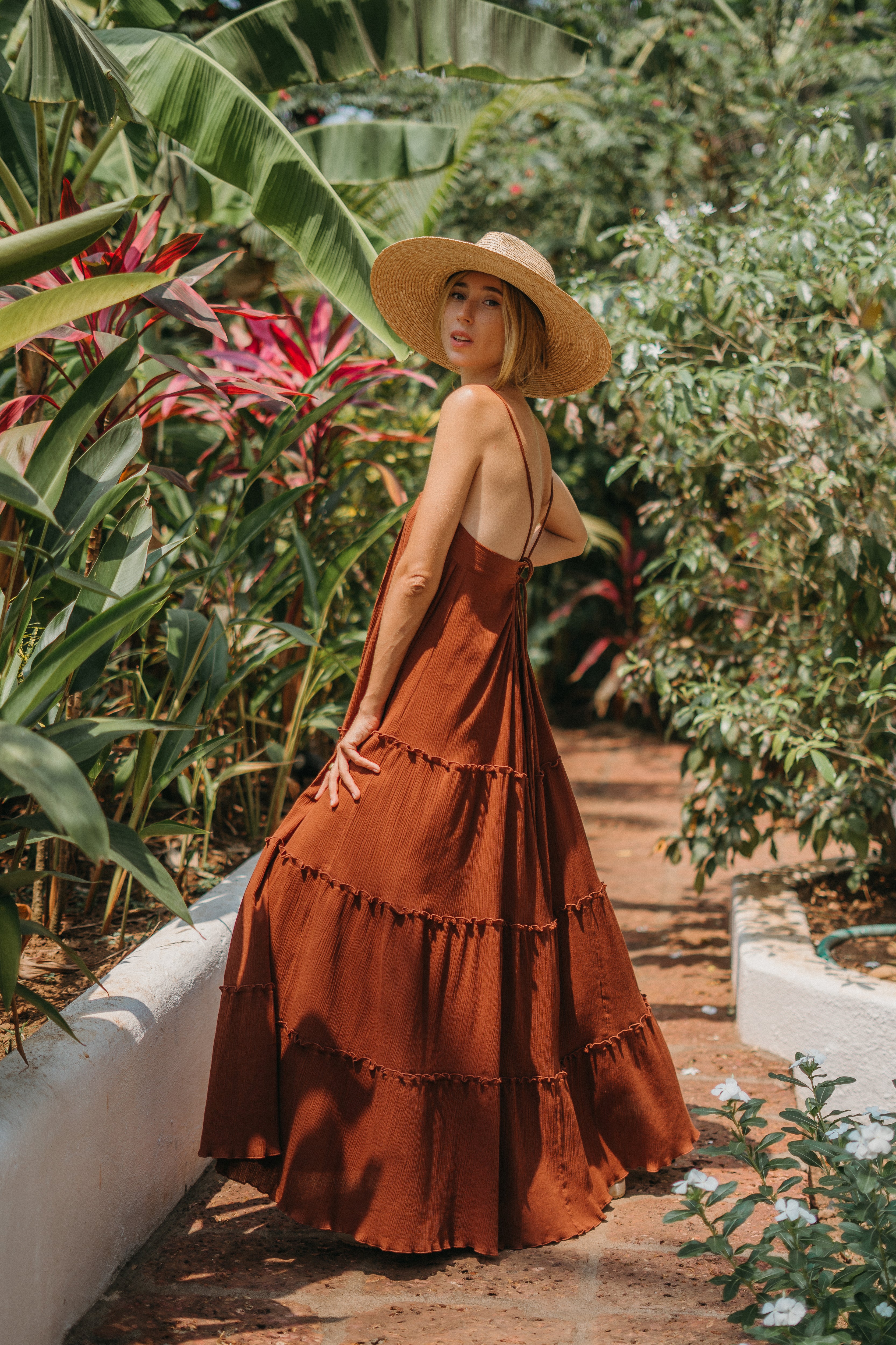 The dress has a relaxed a line fit. It has a tie back that gives you an adjustable sleeve length and creates a plunge back.