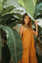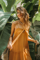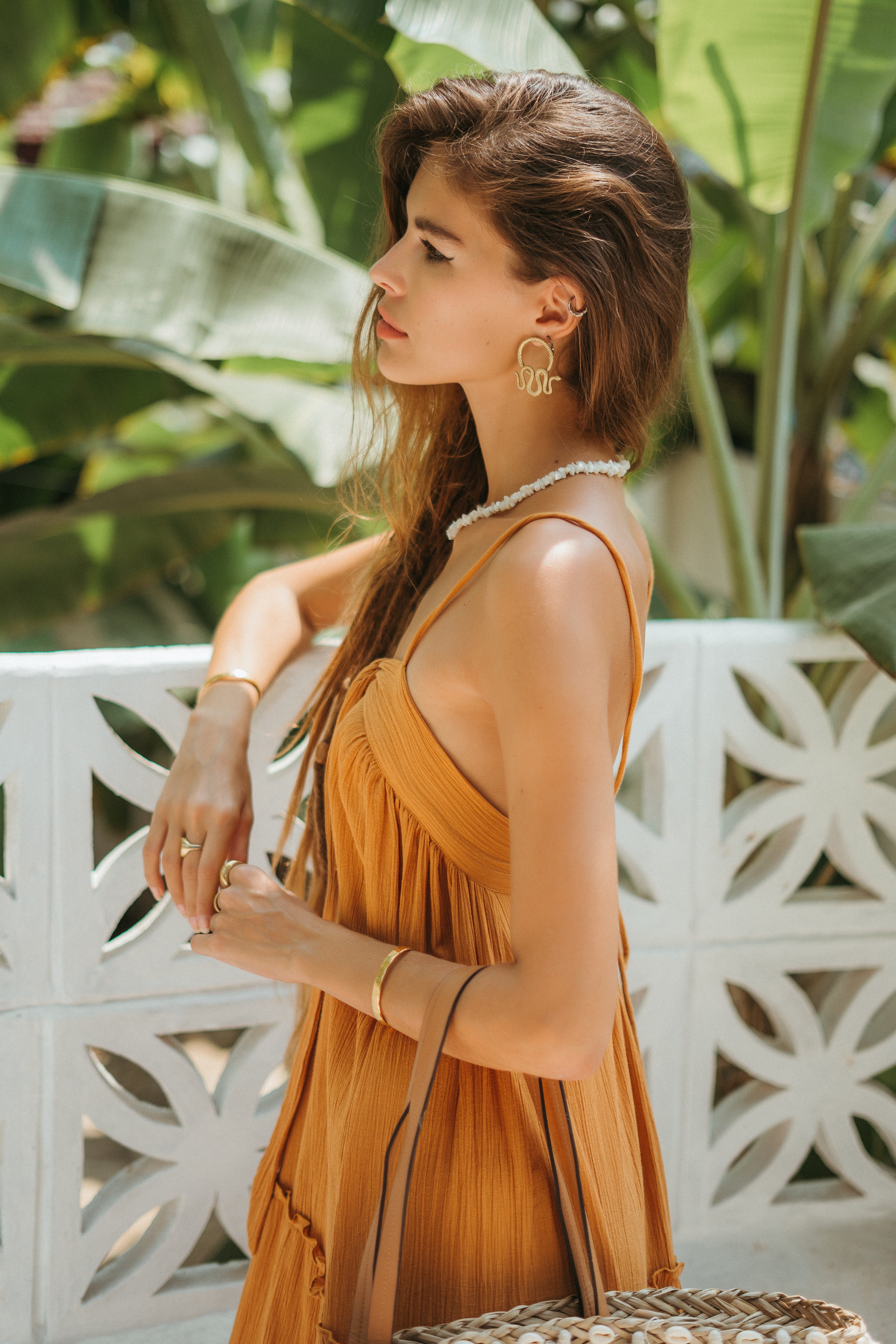 The dress has a relaxed a line fit. It has a tie back that gives you an adjustable sleeve length and creates a plunge back.