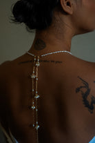 Handcrafted scarf style pearl necklace with a pearl front and drops in the back.