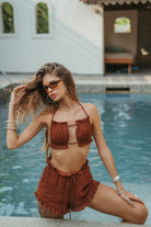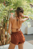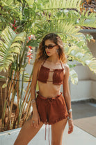 The shorts have a relaxed fit, ruffles on waist with a gentle elastic and drawstring. It is paired with a rectangle bikini which can be tied in multiple ways.