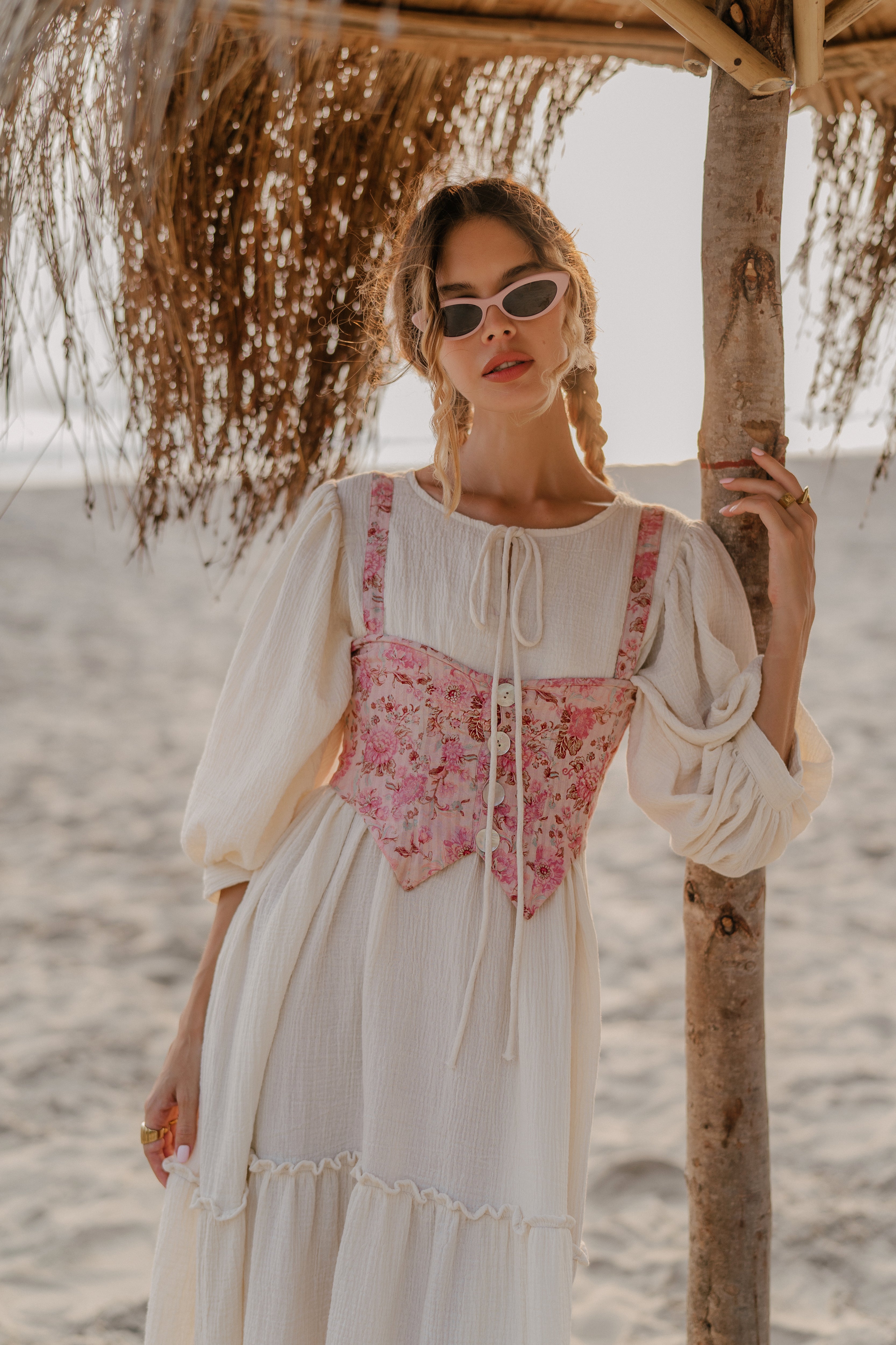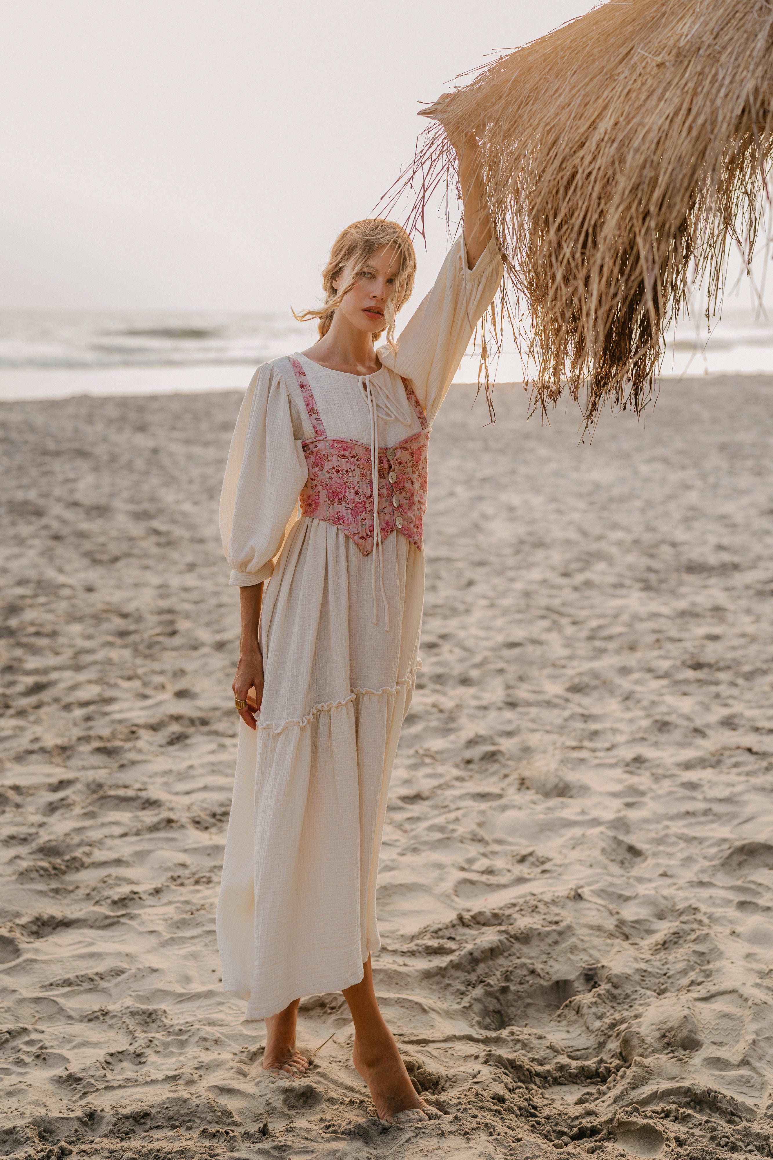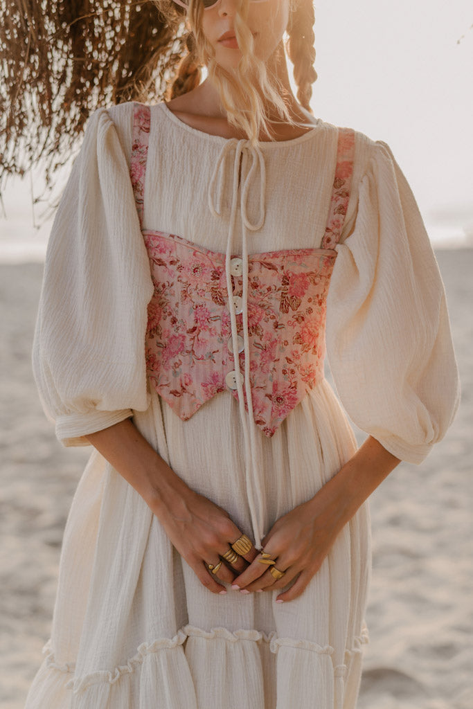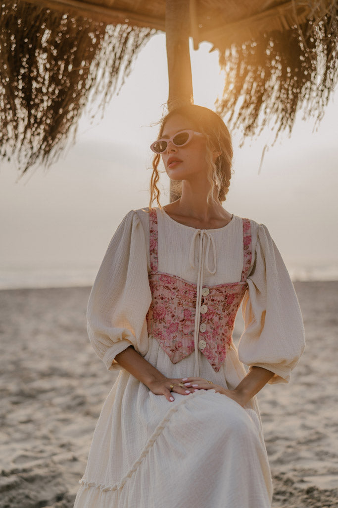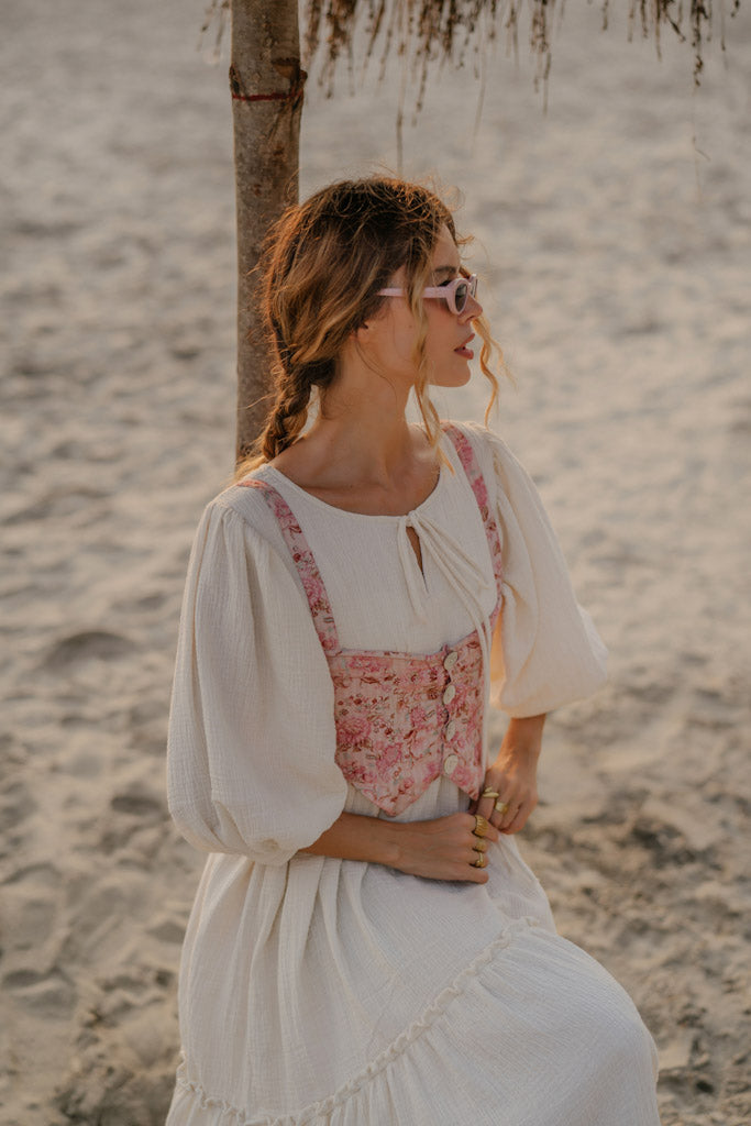 Our bestseller, Elysian is a vintage milkmaid dress inspired, tiered maxi dress for a romantic fit. Crafted in 100% kora cotton. The Zephyr corset is a limited edition piece- our first ever corset.