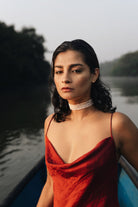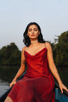 Turn heads in our Scarlet slip dress, crafted from luxurious handwoven mulberry silk. Crafted from luxurious handwoven mulberry silk. With a sultry cowl neckline and a crisscross tie-up back, this our classic red dress. It drapes beautifully over your body, making it the ultimate choice for festive evenings, romantic dates, or formal occasions. Lightweight yet striking, this is your wardrobe’s ultimate showstopper. Pair it with minimal jewellery such as a pearl rope and heels to let the dress speak for itself. Scarf Included.