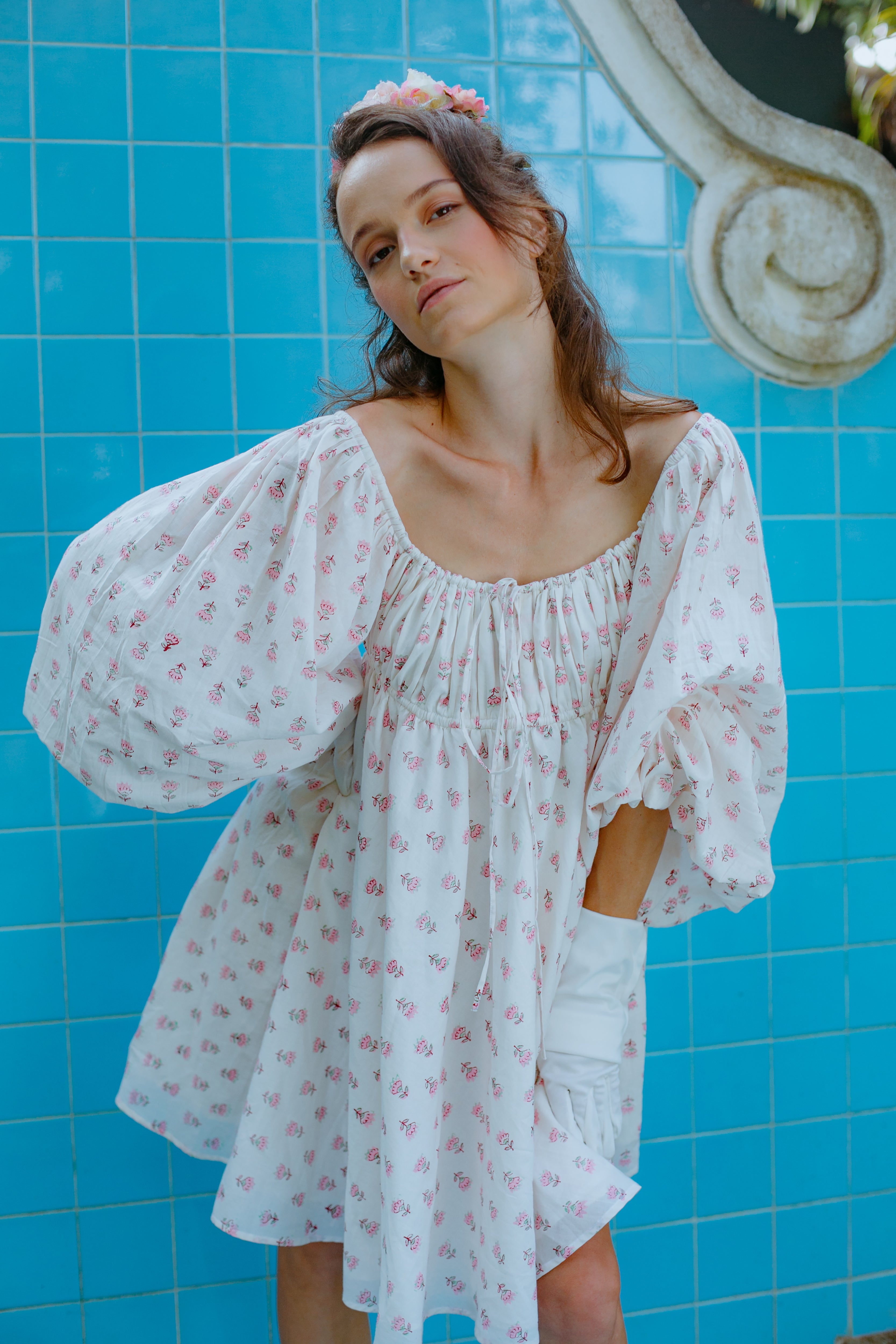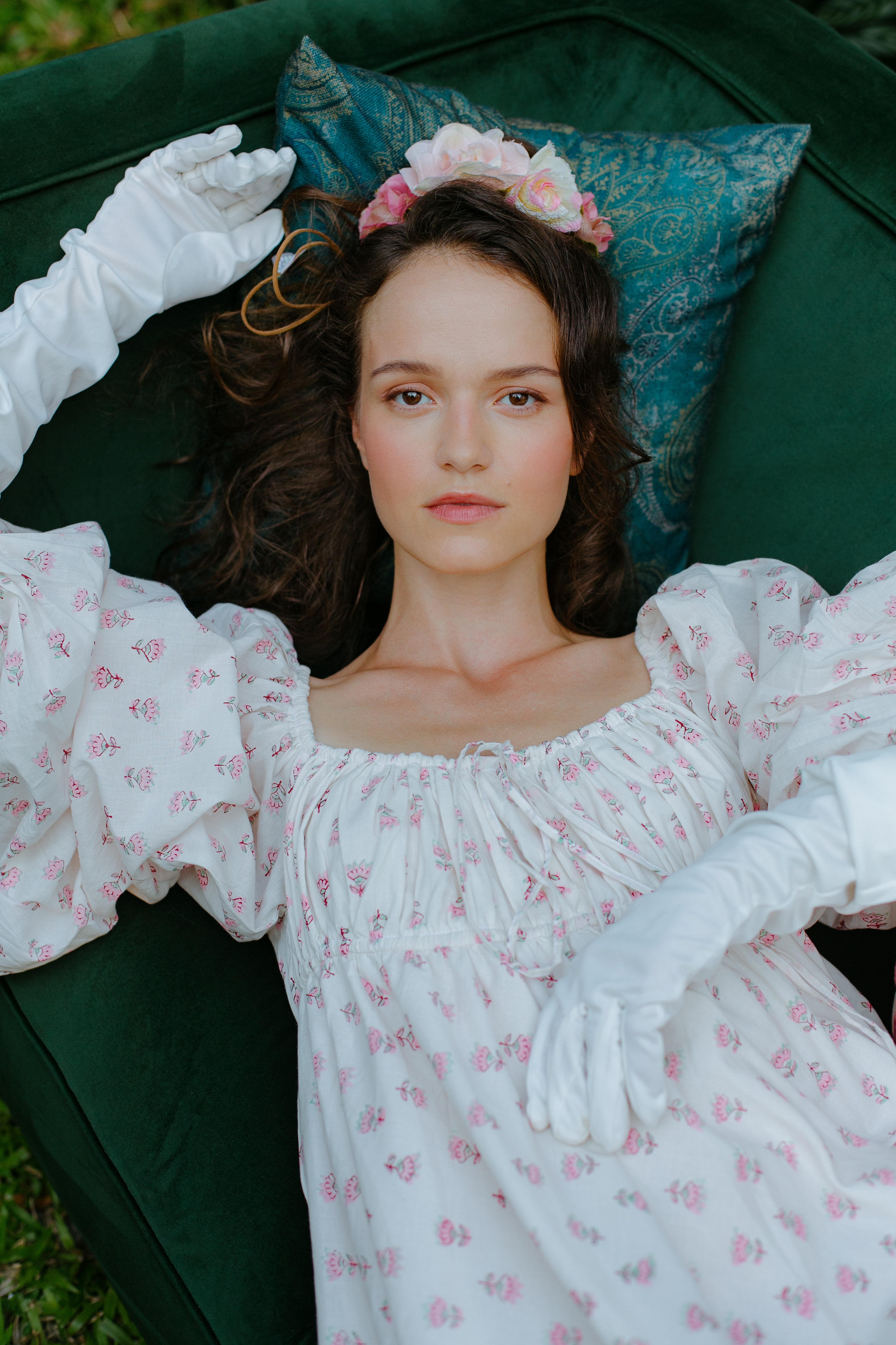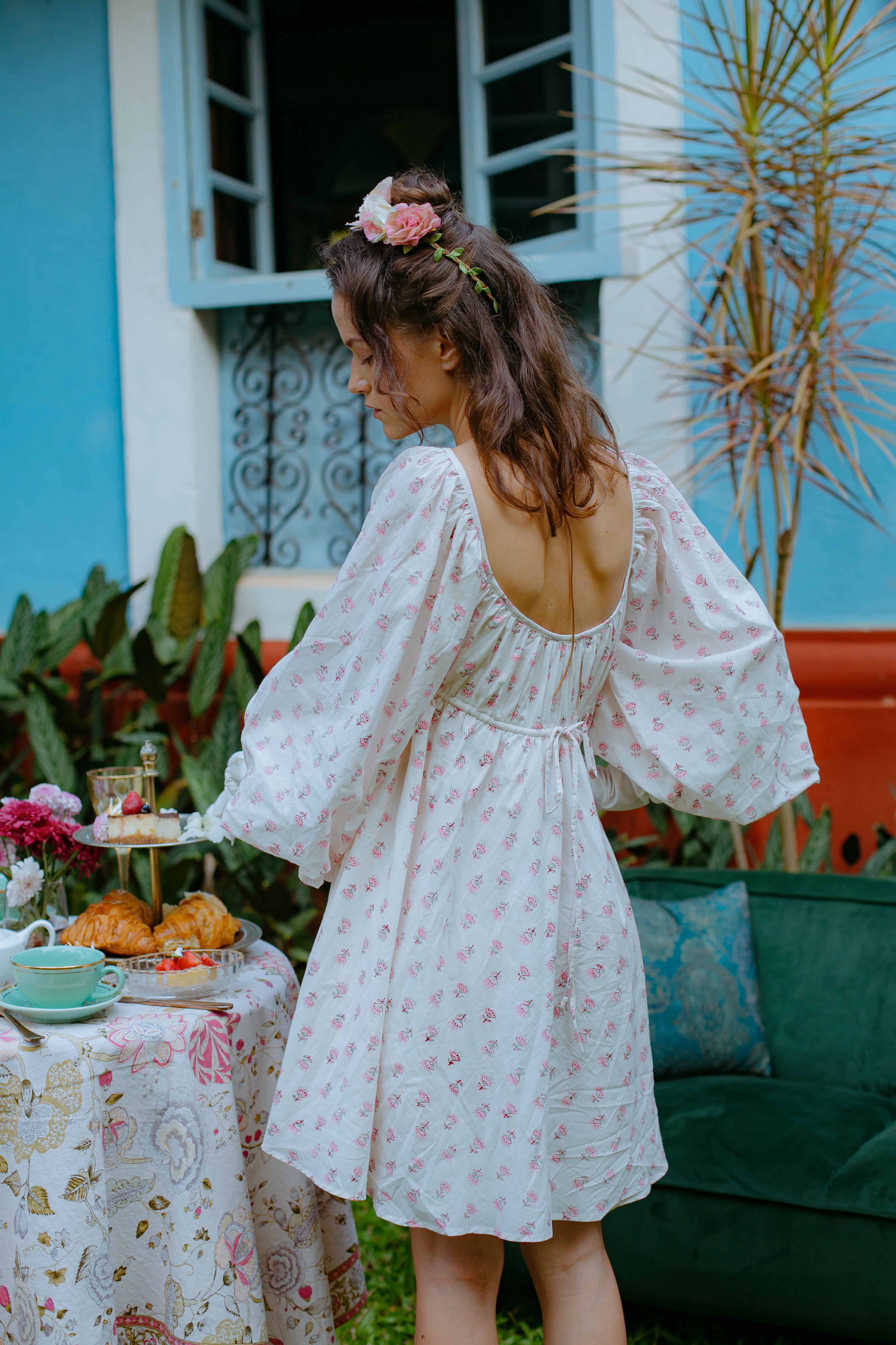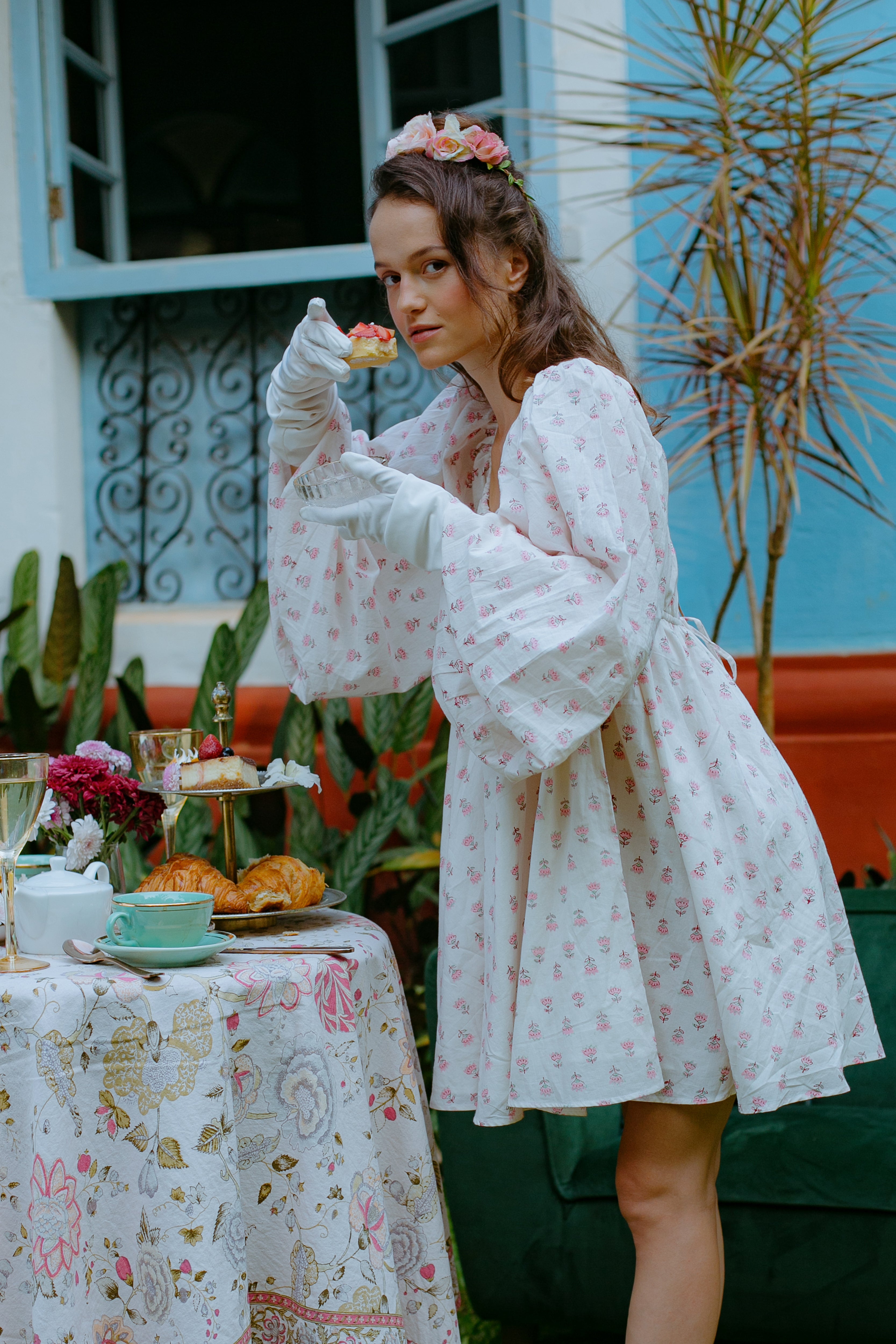Little white dress with adjustable bust and waist, full flare body and bishop sleeves. Made with over 8 yards of handmade fabric, this luxe dress feels as regal as it looks. The dress is fully lined and made up of cottage core, garden tea party dreams.