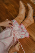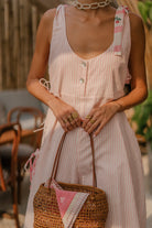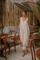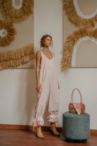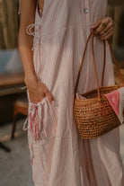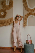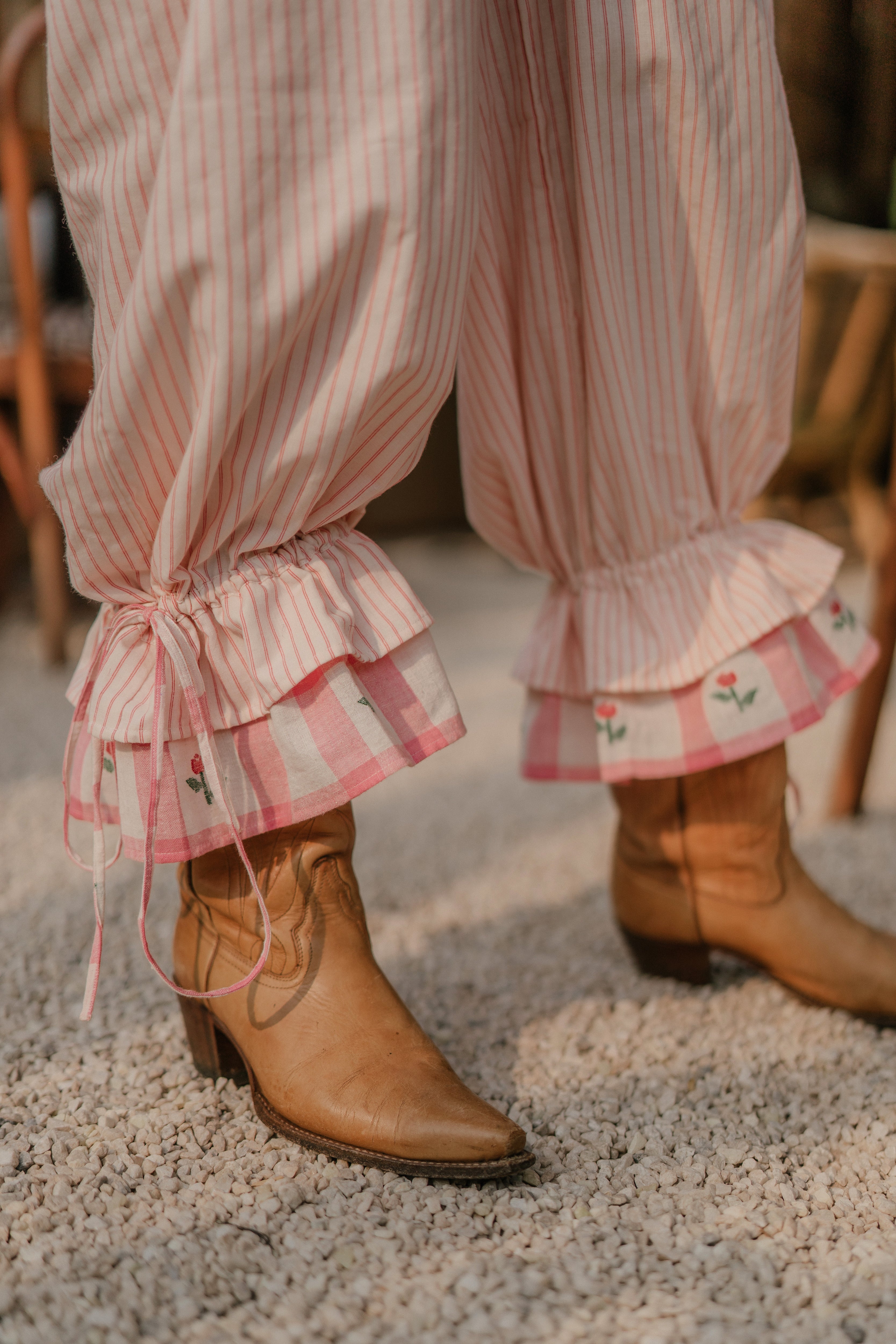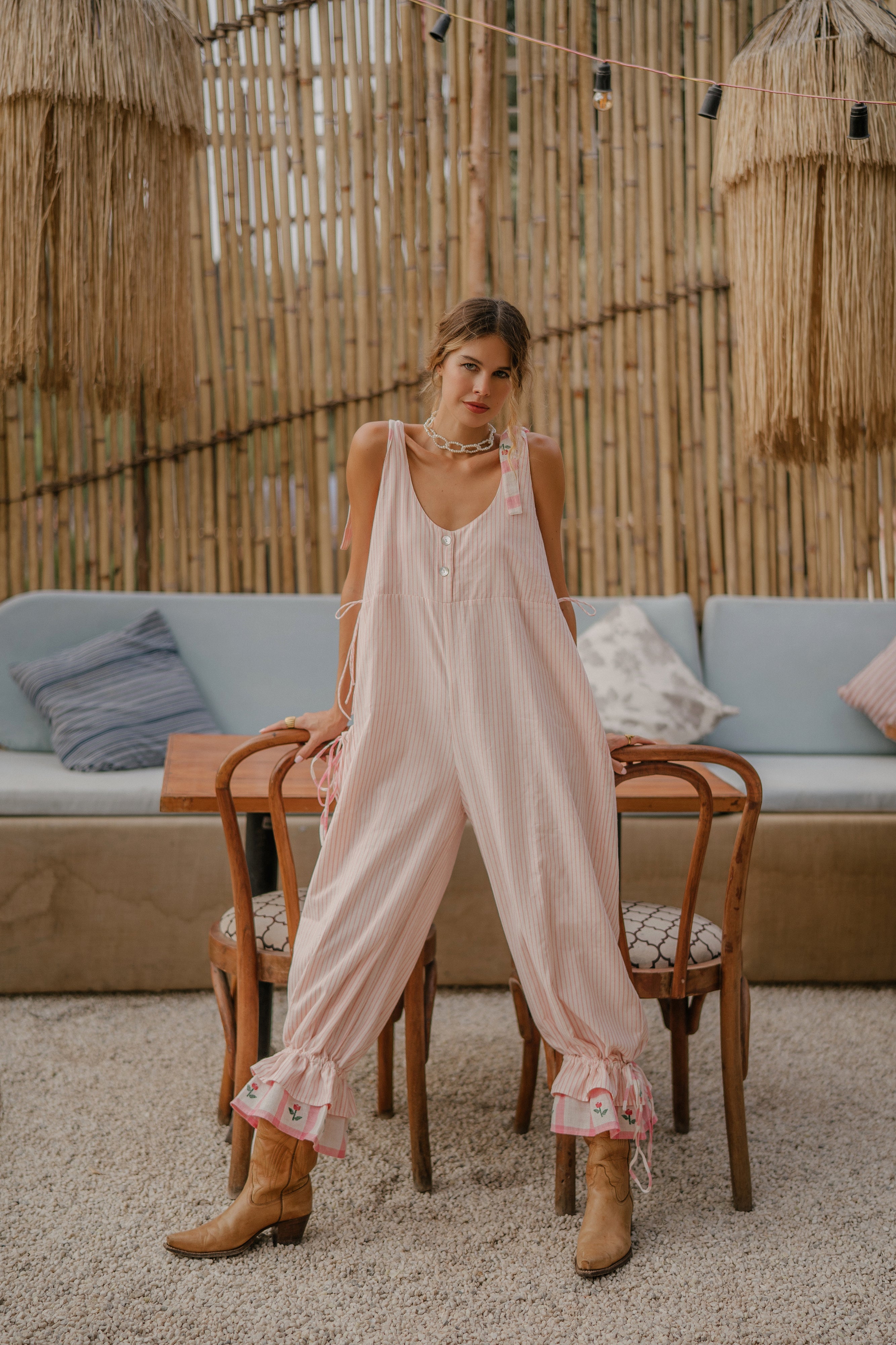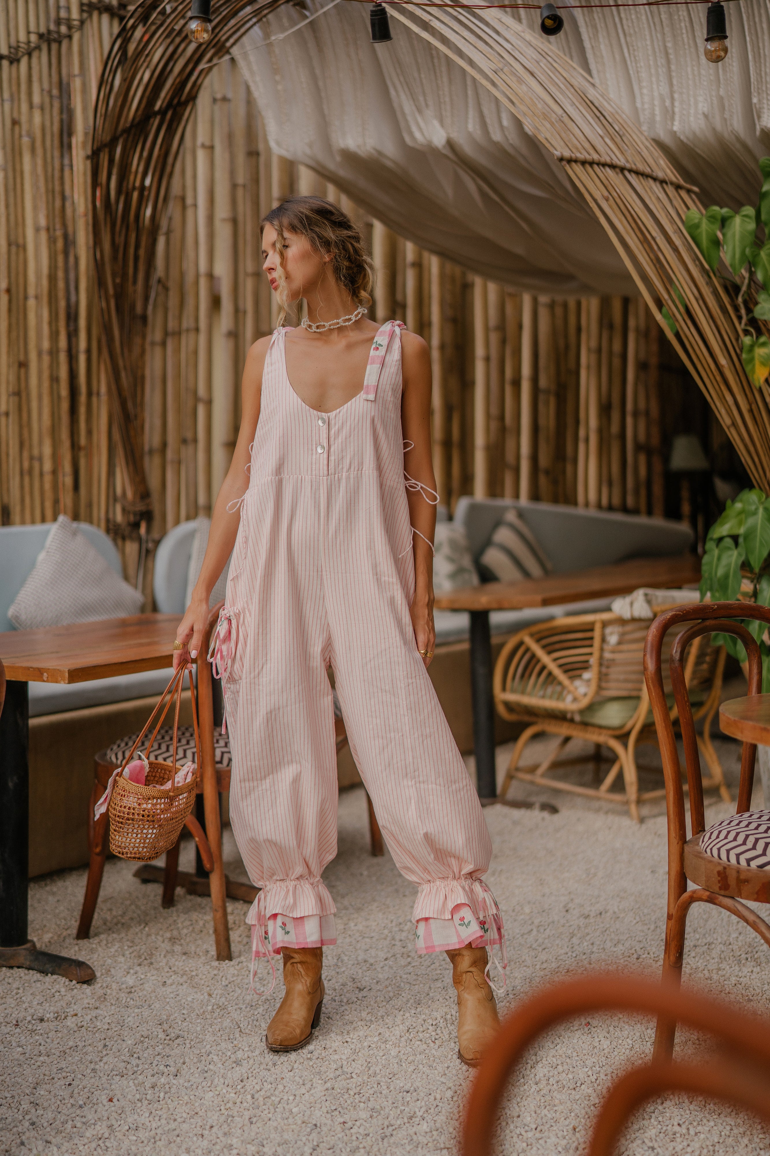 Three layered baggy jumpsuit. Features side tie details, mother of pearl buttons on the bust, drawstring and contrast check jamdani handloom on the ankles. The sleeves are tie up and adjustable. It is a free size piece that fits up to size L.
