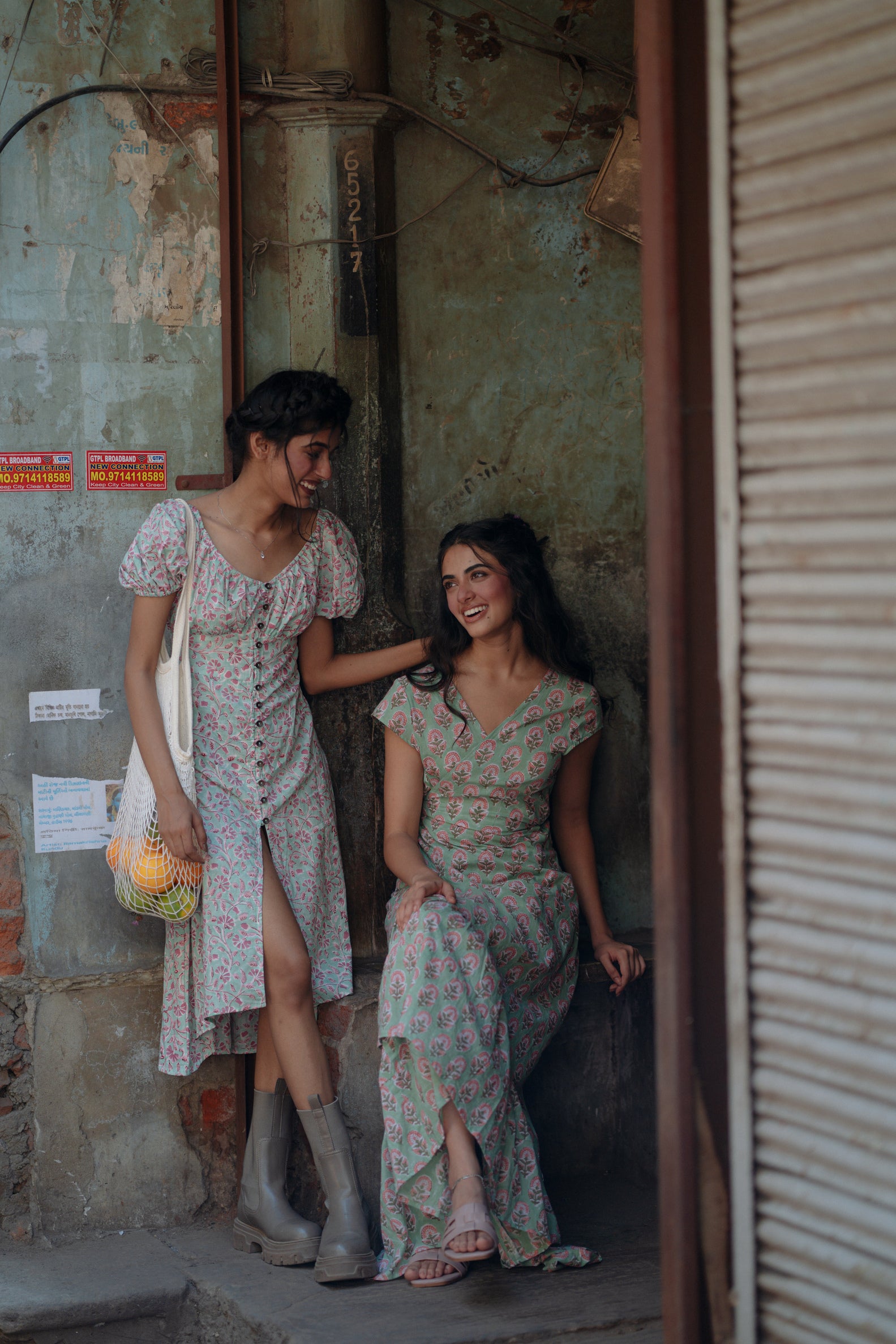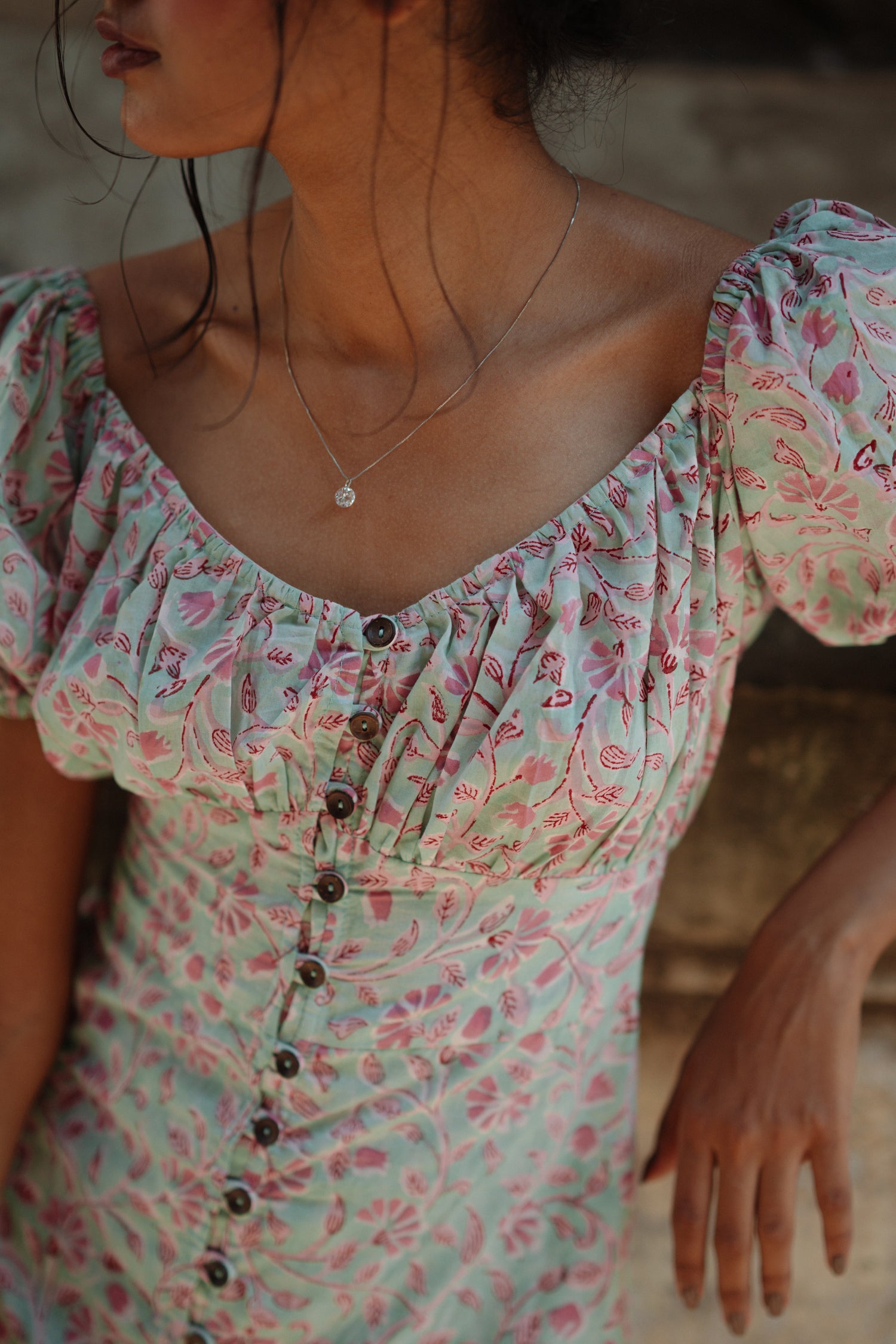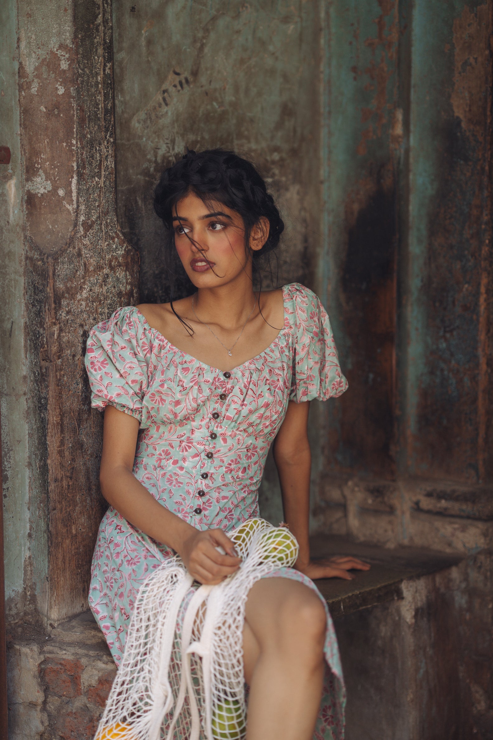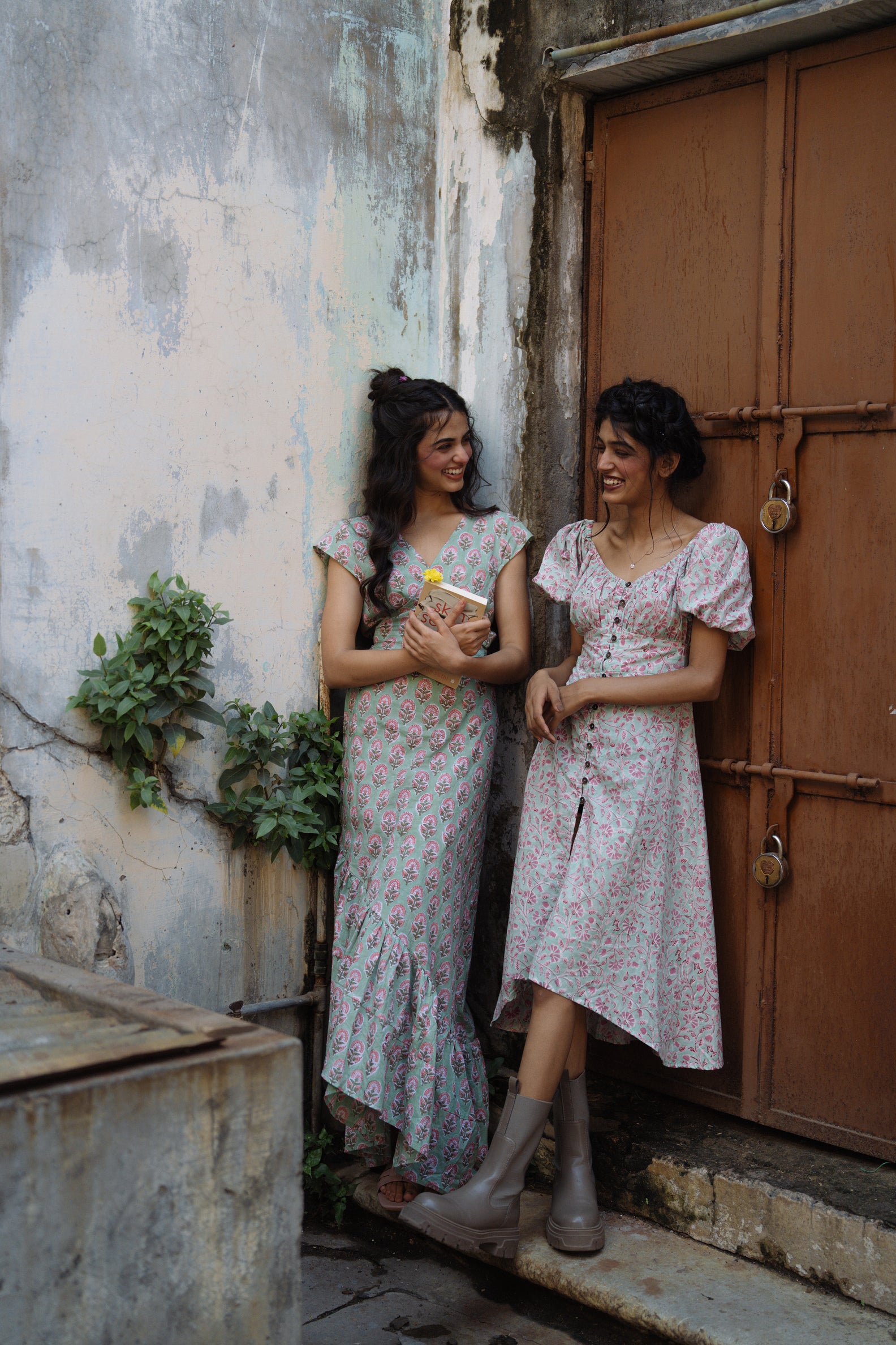 Our best seller midi dress in a gorgeous pastel blue and pink, featuring our signature coconut shell buttons and the gorgeous ruched neckline. Has a fitted upper and a line lower body fit, that enhances your natural shape. The buttons can be opened to get a slit of your preference and the length and number of buttons increase as per height.