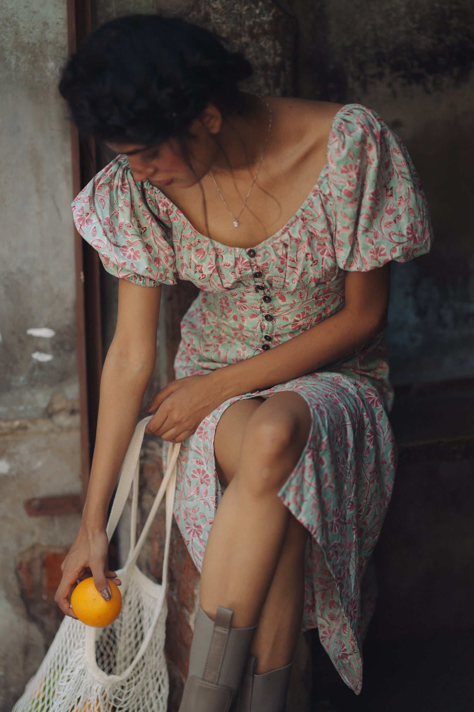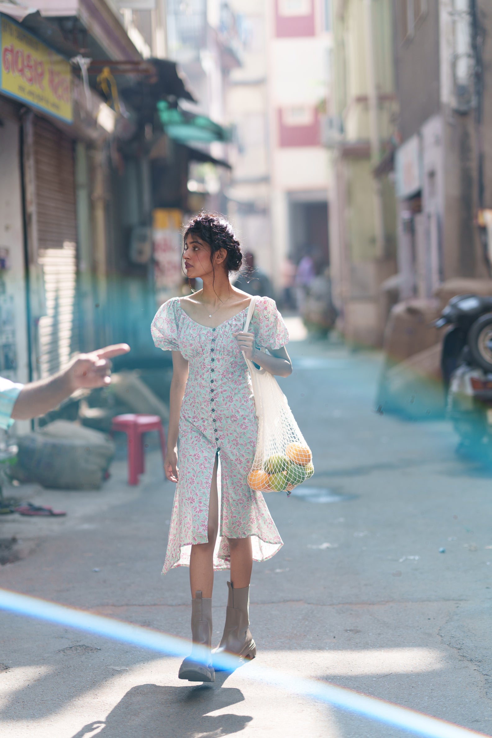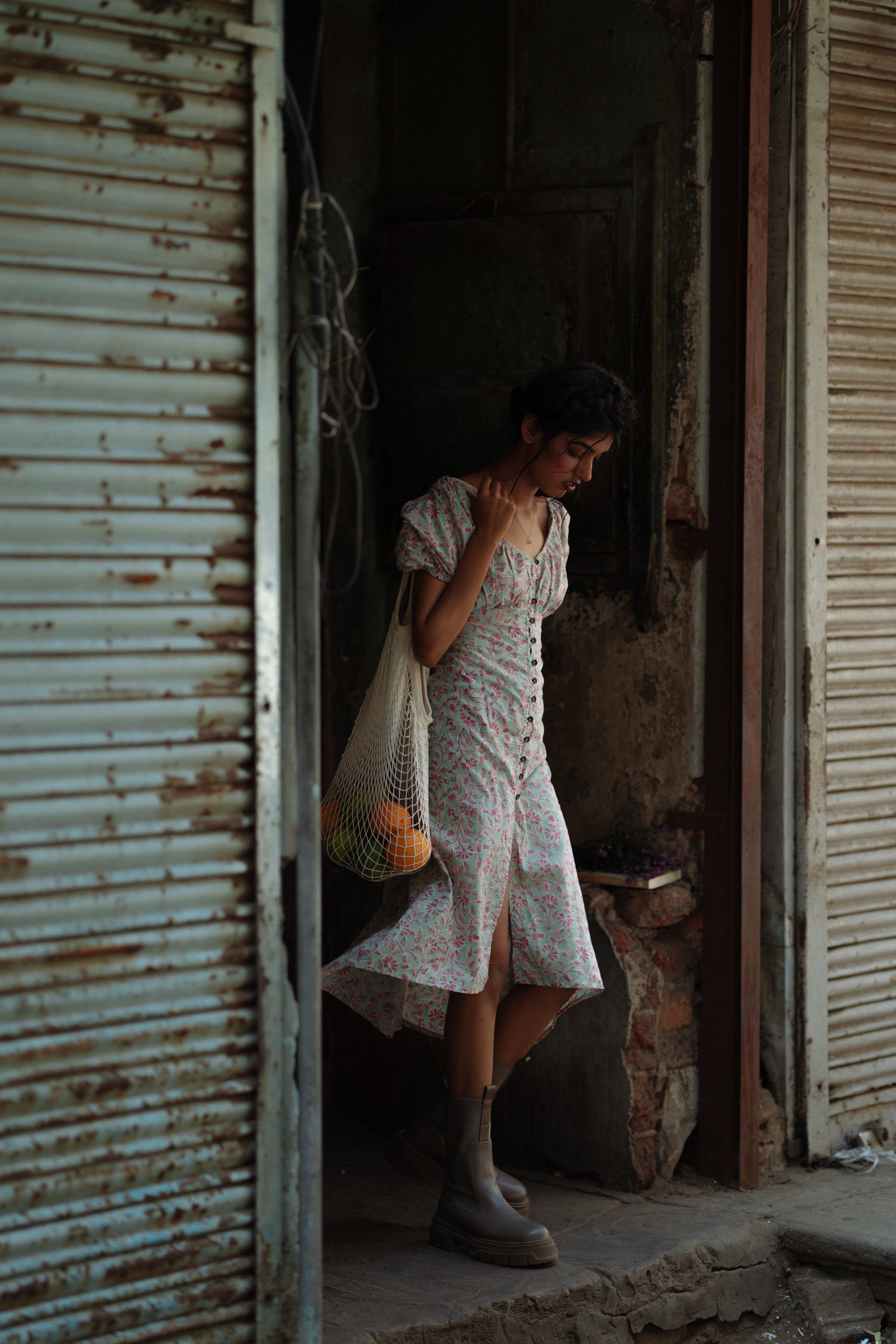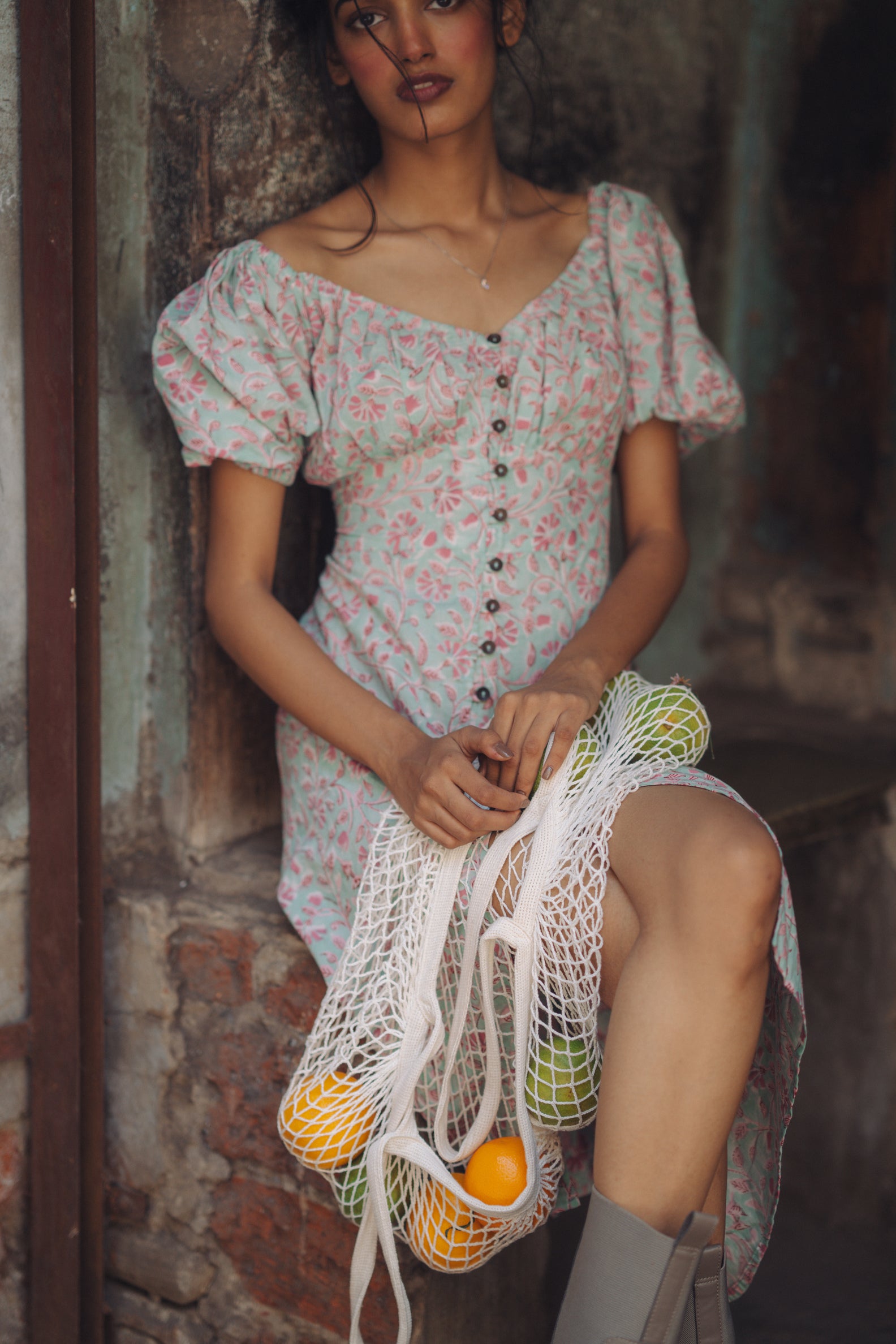 Our best seller midi dress in a gorgeous pastel blue and pink, featuring our signature coconut shell buttons and the gorgeous ruched neckline. Has a fitted upper and a line lower body fit, that enhances your natural shape. The buttons can be opened to get a slit of your preference and the length and number of buttons increase as per height.