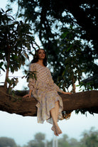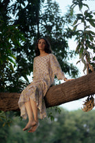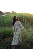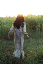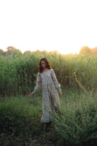 This dress carries a modest silhouette with a flowing skirt that evokes an old-world charm. Thoughtful details bring it to life. Coconut button closure at the back, cuffed sleeves with gentle cinching, and a bib-style contrast patch adorning both the front and back. A timeless piece, designed to move through every season.