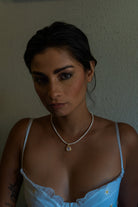 Handcrafted pearl choker with a moonstone amulet in the shape of a dew drop.