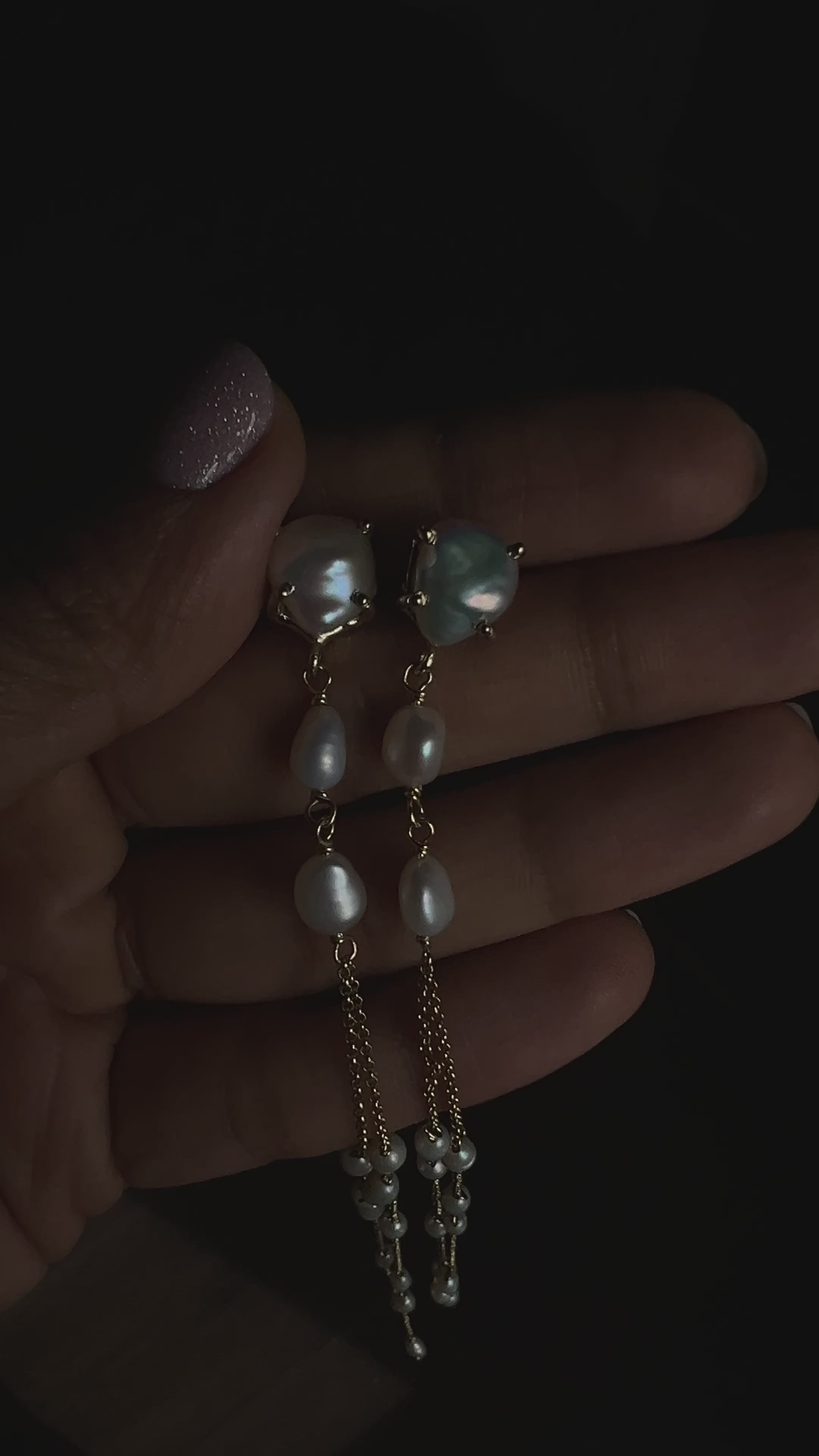 Handcrafted shoulder duster style pearl earrings.