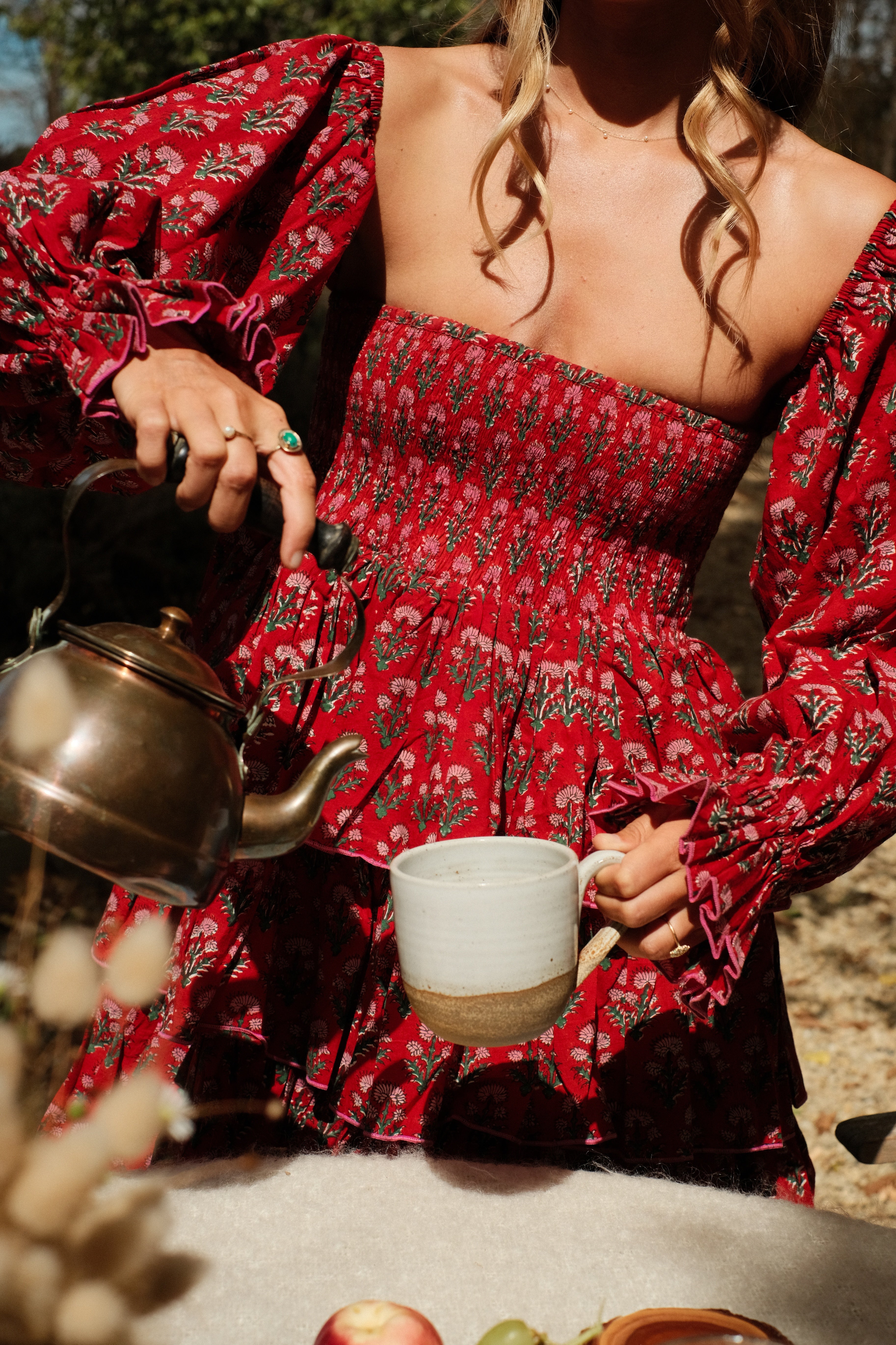Flirty and full of charm, the Amore Mini is our springtime love letter—a shorter take on our beloved Amore Dress. With tiered ruffles, puffed sleeves, a cinched bodice, and contrast pico detailing throughout, it’s made to move with joy. The neckline can be worn on or off the shoulder, shifting effortlessly from sunny afternoon playfulness to romantic twilight wanderings. A piece that captures the season’s lighthearted spirit.