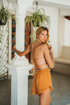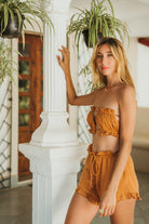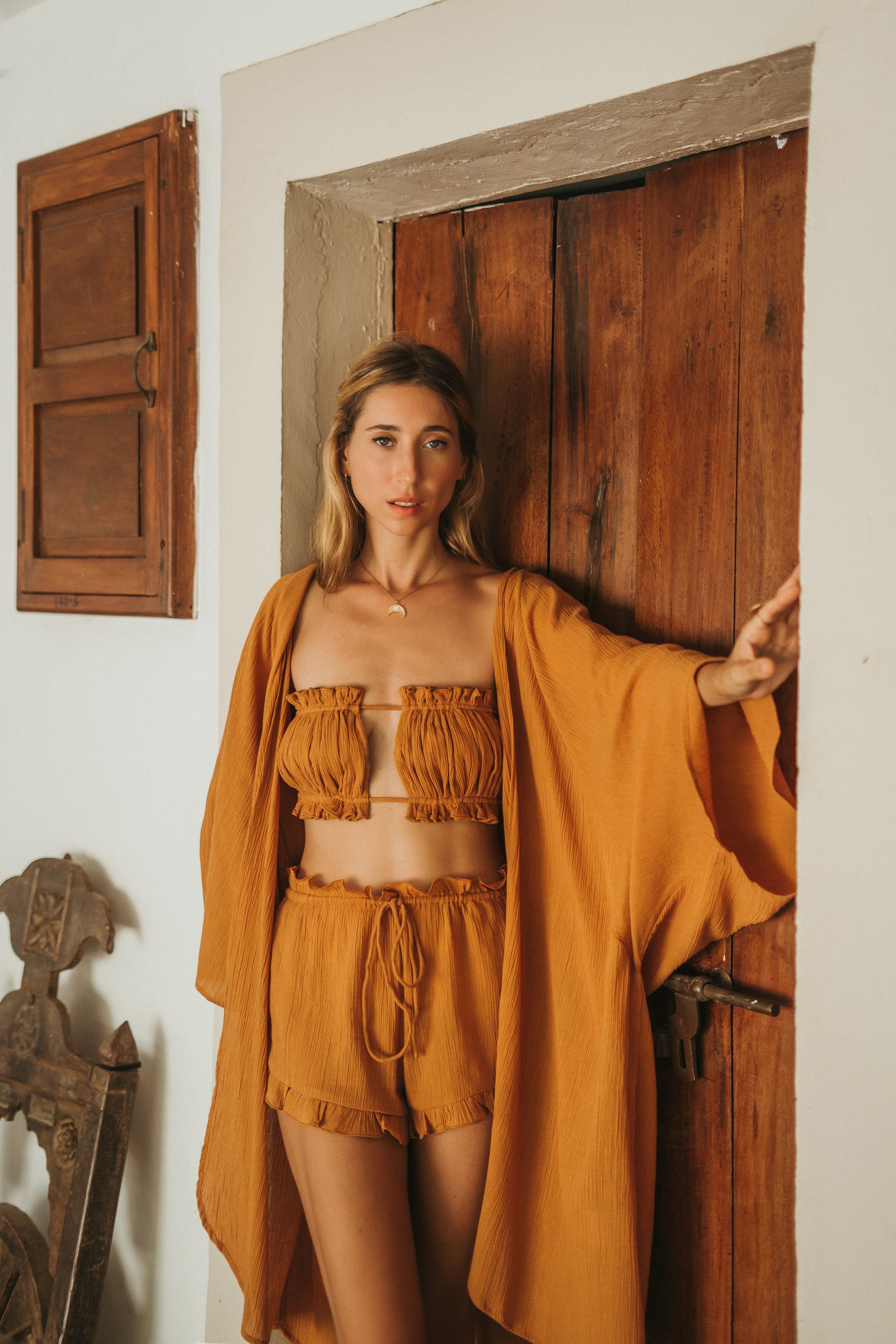 The shorts have a relaxed fit, ruffles on waist with a gentle elastic and drawstring. It is paired with a rectangle bikini which can be tied in multiple ways.