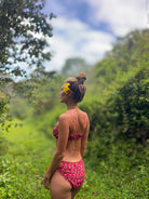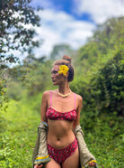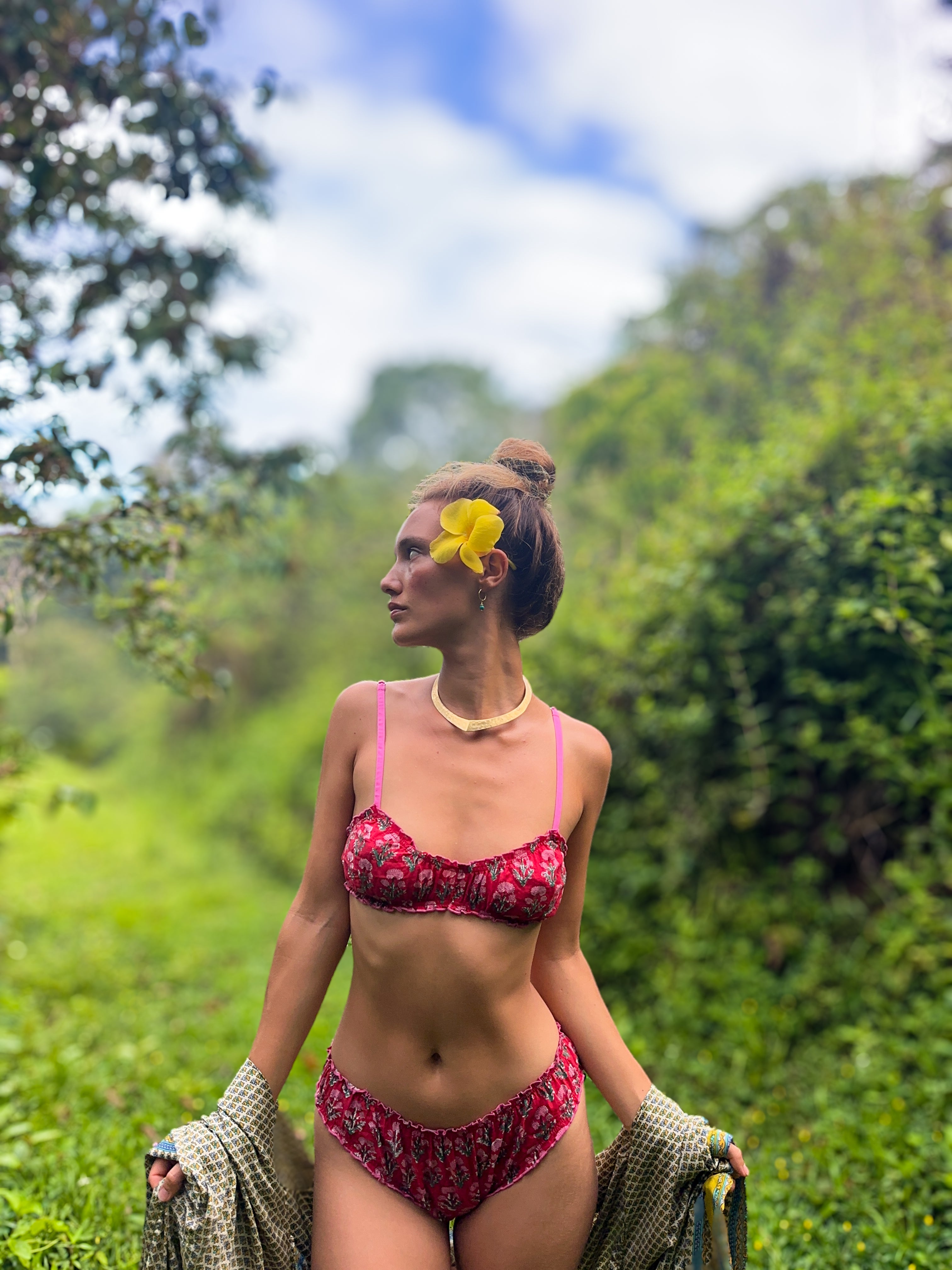A first-of-its-kind in intimate and swimwear, the Hibiscus Set is crafted from 100% cotton fabric, printed by hand using traditional block printing techniques. Thoughtfully designed with high-coverage bottoms, gentle elastic at the waist and groin, contrast pico edging, and a flattering bustier-style top, this set blends comfort with conscious design. Free from plastic-based fabrics and using only minimal elastic, it's both lounge-ready and swim-approved. A true MAIKAI innovation—designed to feel good on the body and do better for the planet. Please pre wash in salt water before use. Meant to be worn in the sea. Do not wear in chlorinated water.