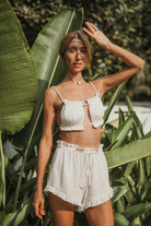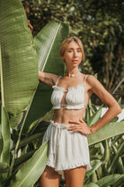 The shorts have a relaxed fit, ruffles on waist with a gentle elastic and drawstring. It is paired with a rectangle bikini which can be tied in multiple ways.