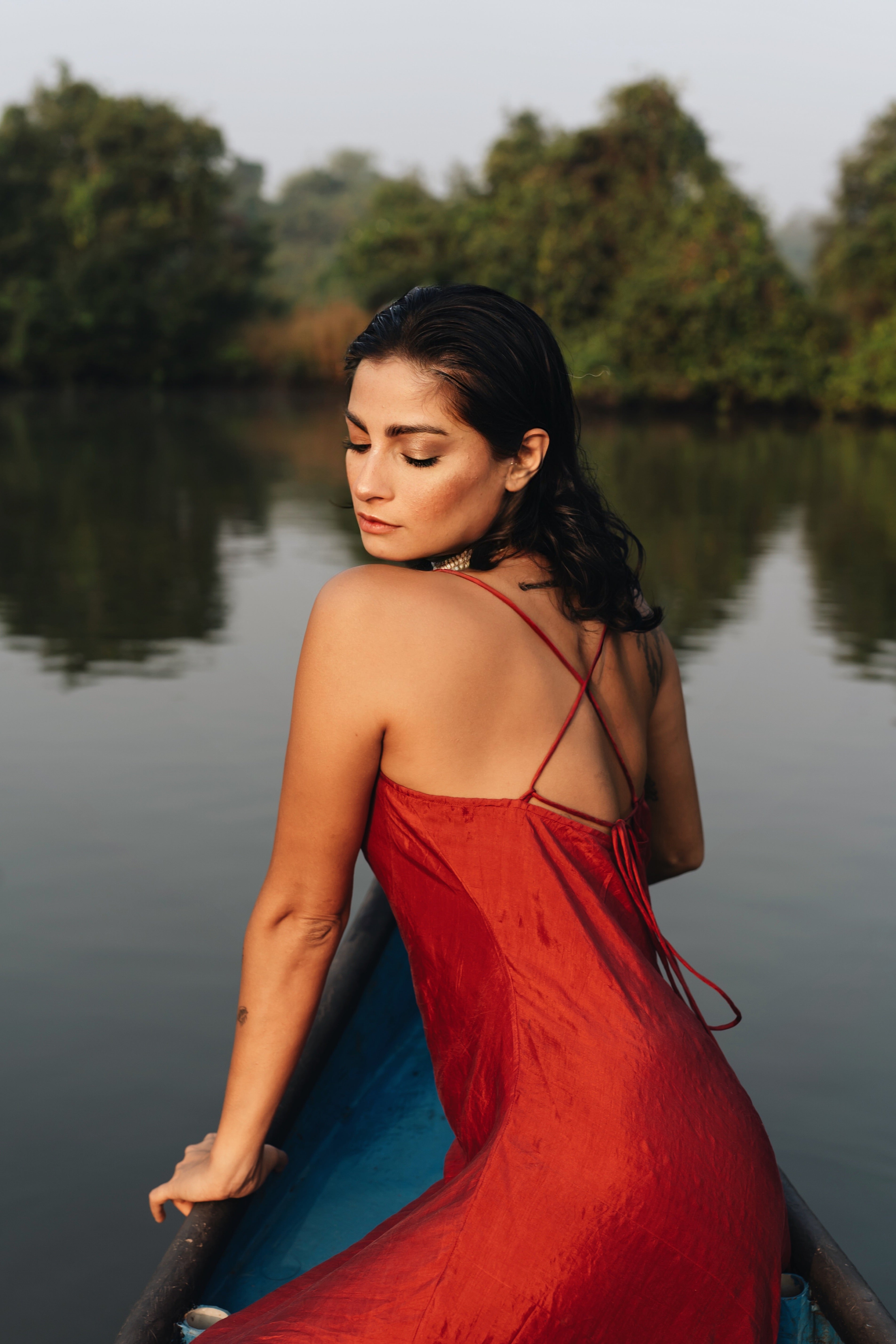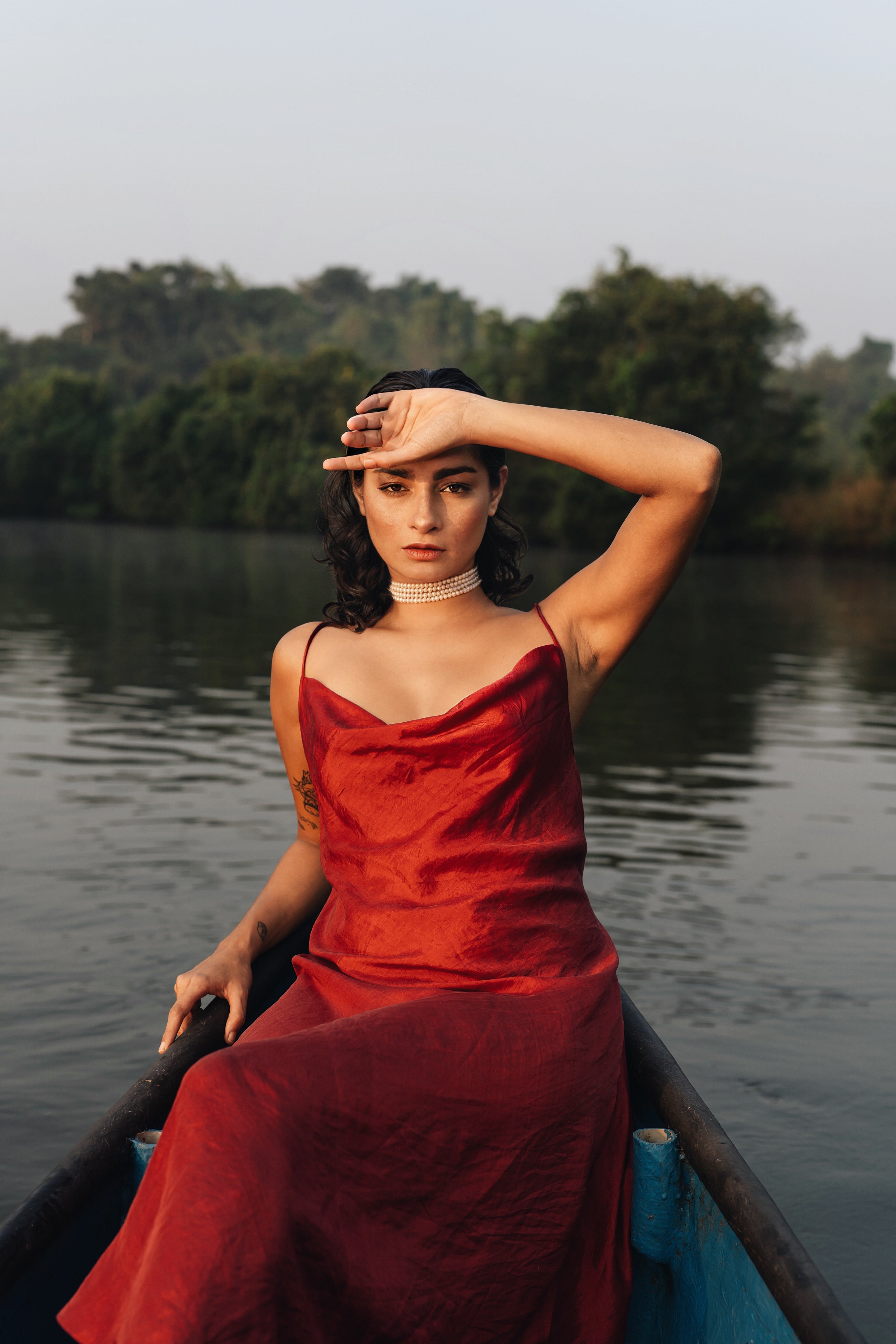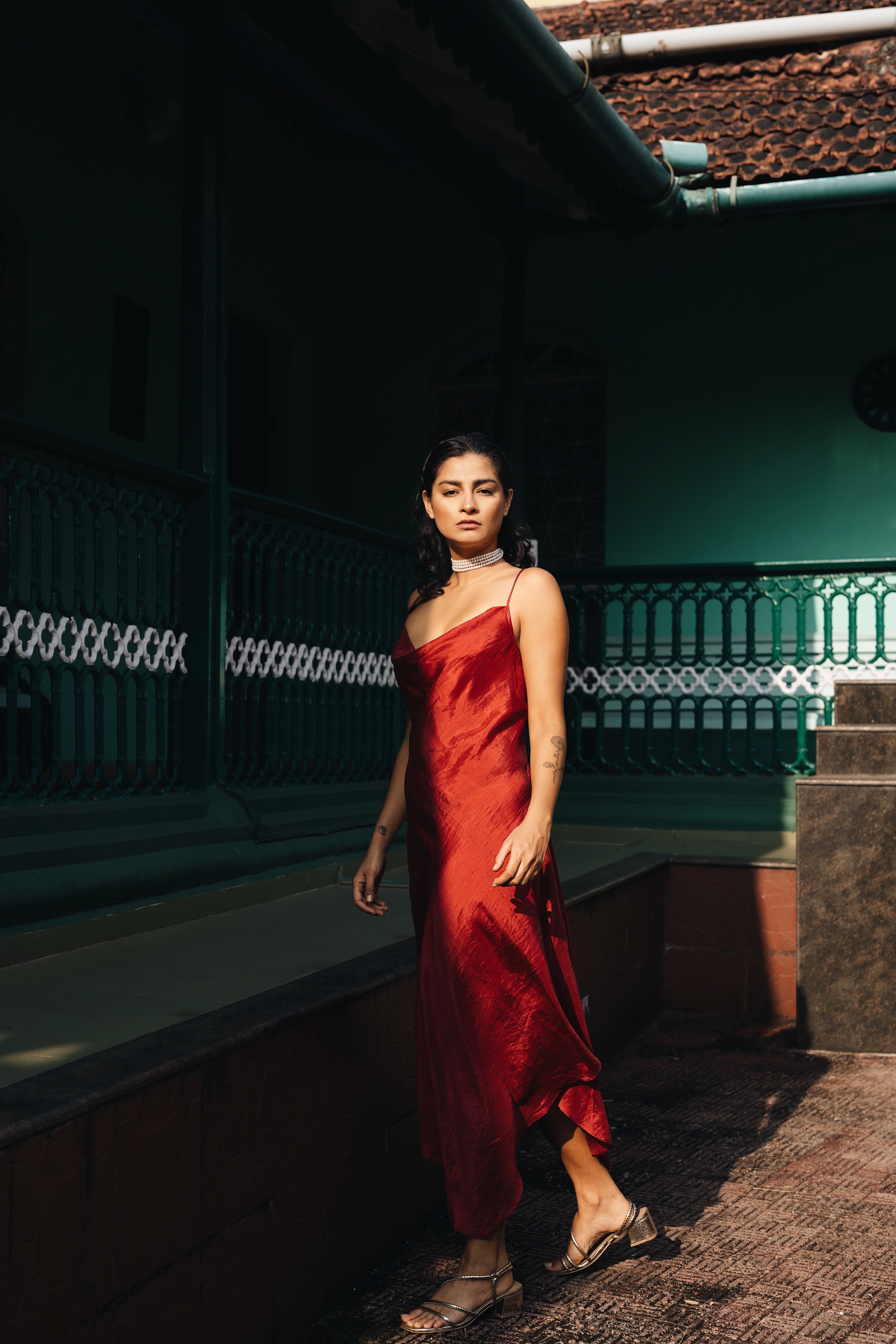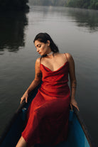 Turn heads in our Scarlet slip dress, crafted from luxurious handwoven mulberry silk. Crafted from luxurious handwoven mulberry silk. With a sultry cowl neckline and a crisscross tie-up back, this our classic red dress. It drapes beautifully over your body, making it the ultimate choice for festive evenings, romantic dates, or formal occasions. Lightweight yet striking, this is your wardrobe’s ultimate showstopper. Pair it with minimal jewellery such as a pearl rope and heels to let the dress speak for itself. Scarf Included.